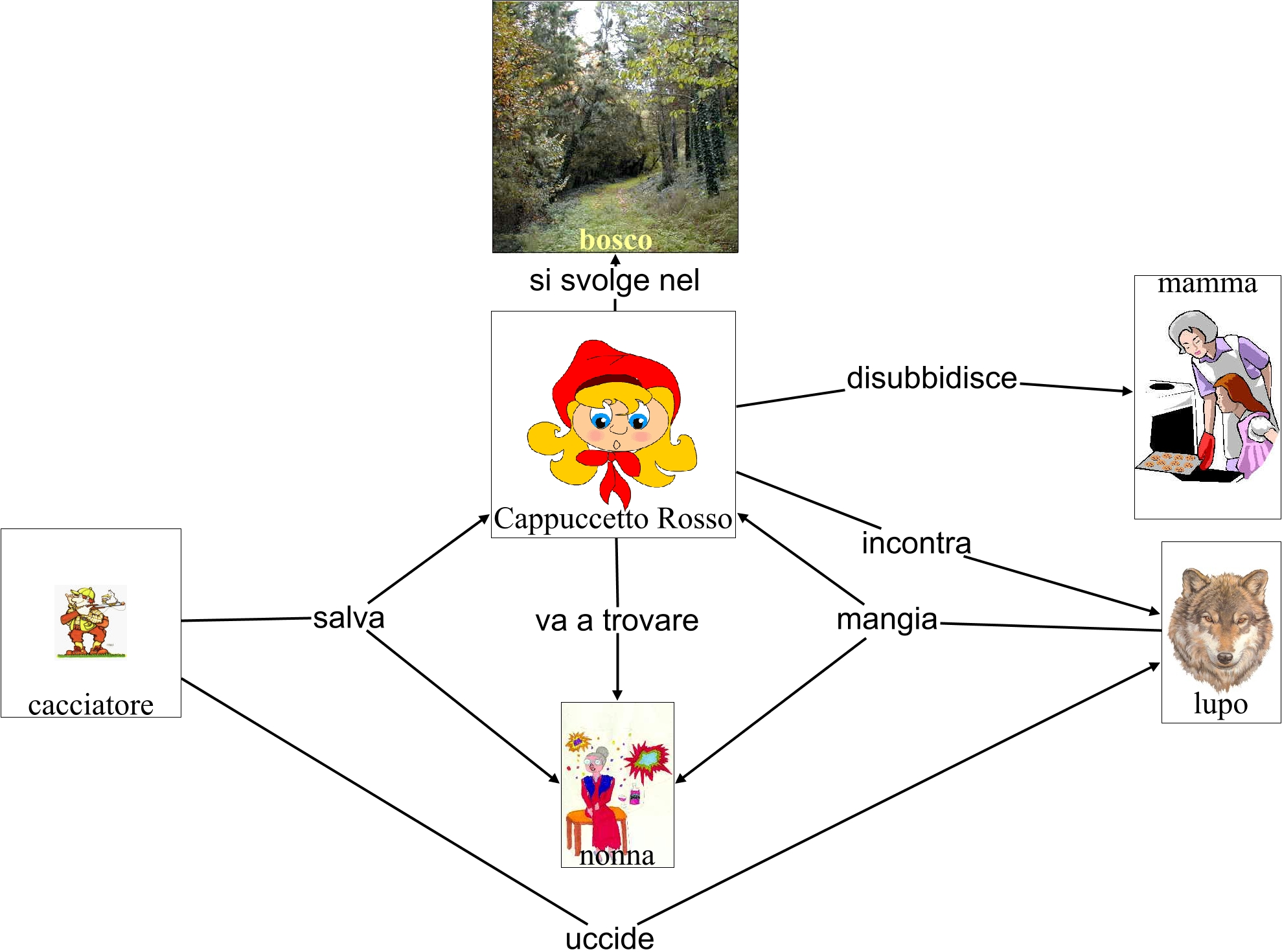 cappuccettorosso, Cappuccetto Rosso va a trovare nonna, lupo mangia nonna, Cappuccetto Rosso disubbidisce mamma, cacciatore uccide lupo, Cappuccetto Rosso incontra lupo, cacciatore salva Cappuccetto Rosso, Cappuccetto Rosso si svolge nel bosco, lupo mangia Cappuccetto Rosso, cacciatore salva nonna