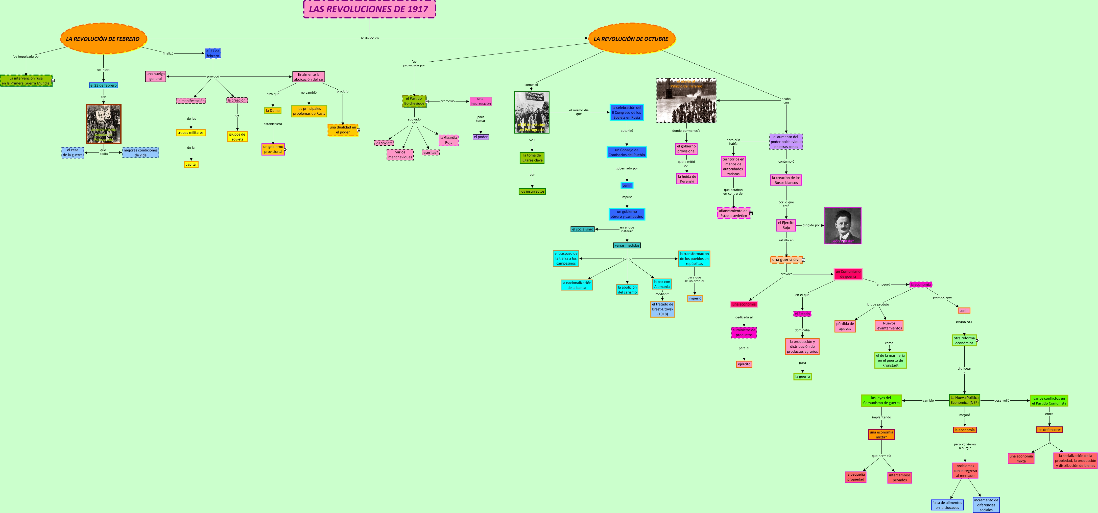 Este Cmap, tiene información relacionada con: LAS REVOLUCIONES DE 1917, el número de productos reduciendo la compra de productos, la corte influenciada por el monje Rasputín*, la economía lo que produjo pérdida de apoyos, varias medidas como la paz con Alemania, un gran números de muertos por un ejército incompetente, la celebración del II Congreso de los Soviets en Rusia autorizó un Consejo de Comisarios del Pueblo, el Partido Bolchevique apoyado por eseritas*, el aumento del poder bolchevique en otras zonas contempló la creación de los Rusos blancos, otra reforma económica para mejorar las condiciones de vida, el 25 de octubre en Petrogrado el mismo día que la celebración del II Congreso de los Soviets en Rusia, la utilización de campesinos en la guerra redujo la producción agrícola, la manifestación de las tropas militares, el Partido Bolchevique creó la URSS* en 1922, Rusos blancos que controlaban el este, La Nueva Política Económica (NEP) mejoró la economía, el número de productos incrementando los precios, la creación de grupos de soviets, varias medidas como la abolición del zarismo, las leyes del Comunismo de guerra implantando una economía mixta*, territorios en manos de autoridades zaristas que estaban en contra del afianzamiento del Estado soviético