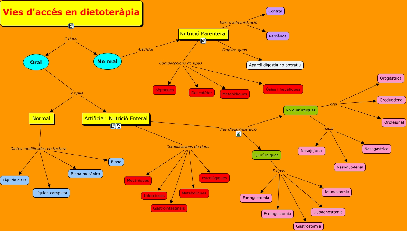 Este Cmap, tiene información relacionada con: Vies dacces en dietoterapia, Artificial: Nutrició Enteral Vies d'administració Quirúrgiques, Artificial: Nutrició Enteral Complicacions de tipus Psicològiques, Nutrició Parenteral S'aplica quan Aparell digestiu no operatiu, Artificial: Nutrició Enteral Complicacions de tipus Mecàniques, Artificial: Nutrició Enteral Complicacions de tipus Gastrointestinals, Quirúrgiques 5 tipus Jejunostomia, Vies d'accés en dietoteràpia 2 tipus Oral, Artificial: Nutrició Enteral Complicacions de tipus Infeccioses, Nutrició Parenteral Complicacions de tipus Del catèter, Normal Dietes modificades en textura Blana, Normal Dietes modificades en textura Blana mecànica, Oral 2 tipus Artificial: Nutrició Enteral, No quirúrgiques oral Oroduodenal, No quirúrgiques nasal Nasoduodenal, No quirúrgiques oral Orojejunal, Vies d'accés en dietoteràpia 2 tipus No oral, Nutrició Parenteral Complicacions de tipus Òsies i hepàtiques, No quirúrgiques nasal Nasogàstrica, Quirúrgiques 5 tipus Esofagostomia, Normal Dietes modificades en textura Líquida completa