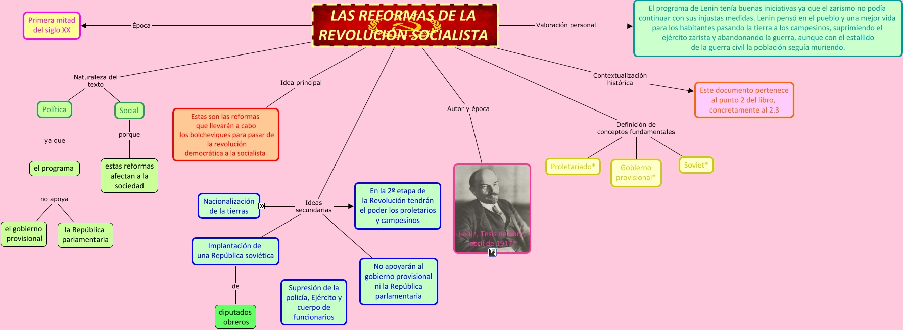 Este Cmap, tiene información relacionada con: COMENTARIO DE TEXTO PG- 139, LAS REFORMAS DE LA REVOLUCIÓN SOCIALISTA Naturaleza del texto Social, Política ya que el programa, LAS REFORMAS DE LA REVOLUCIÓN SOCIALISTA Definición de conceptos fundamentales Gobierno provisional*, LAS REFORMAS DE LA REVOLUCIÓN SOCIALISTA Época Primera mitad del siglo XX, LAS REFORMAS DE LA REVOLUCIÓN SOCIALISTA Naturaleza del texto Política, Nacionalización de las tierras podrán acceder diputados, LAS REFORMAS DE LA REVOLUCIÓN SOCIALISTA Ideas secundarias ????, LAS REFORMAS DE LA REVOLUCIÓN SOCIALISTA Contextualización histórica Este documento pertenece al punto 2 del libro, concretamente al 2.3, LAS REFORMAS DE LA REVOLUCIÓN SOCIALISTA Definición de conceptos fundamentales Proletariado*, LAS REFORMAS DE LA REVOLUCIÓN SOCIALISTA Valoración personal El programa de Lenin tenía buenas iniciativas ya que el zarismo no podía continuar con sus injustas medidas. Lenin pensó en el pueblo y una mejor vida para los habitantes pasando la tierra a los campesinos, suprimiendo el ejército zarista y abandonando la guerra, aunque con el estallido de la guerra civil la población seguía muriendo., LAS REFORMAS DE LA REVOLUCIÓN SOCIALISTA Autor y época Lenin, Tesis de abril, abril de 1917*, Nacionalización de las tierras podrán acceder campesinos, LAS REFORMAS DE LA REVOLUCIÓN SOCIALISTA Idea principal Estas son las reformas que llevarán a cabo los bolcheviques para pasar de la revolución democrática a la socialista, el programa no apoya la República parlamentaria, Nacionalización de las tierras podrán acceder los soviets locales, LAS REFORMAS DE LA REVOLUCIÓN SOCIALISTA Definición de conceptos fundamentales Soviet*, Implantación de una República soviética de diputados obreros, el programa no apoya el gobierno provisional, Nacionalización de las tierras podrán acceder obreros agrícolas, LAS REFORMAS DE LA REVOLUCIÓN SOCIALISTA Ideas secundarias Implantación de una República soviética