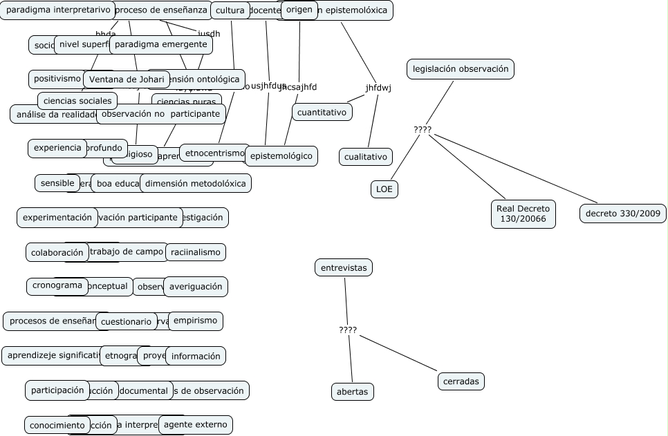 Este mapa conceptual tiene información relacionada a: OA.SP.G2, tres saberes jusdh ciencias puras, origen jhcsajhfd epistemológico, entrevistas ???? cerradas, tres saberes bhda ciencias sociales, proceso de enseñanza iuydiuwa proceso de aprendizaxe, legislación observación ???? LOE, legislación observación ???? Real Decreto 130/20066, tres saberes hsajfdhs religioso, cultura ioudsio etnocentrismo, legislación observación ???? decreto 330/2009, docente usjhfdus discente, entrevistas ???? abertas, dimensión epistemolóxica jhfdwj cualitativo, dimensión epistemolóxica jhfdwj cuantitativo