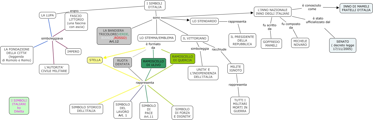 Questa Cmap, creata con IHMC CmapTools, contiene informazioni relative a: I SIMBOLI DELL'ITALIA, STELLA rappresenta SIMBOLO STORICO DELL'ITALIA, L'INNO NAZIONALE INNO DEGLI ITALIANI è conosciuto come INNO DI MAMELI FRATELLI D'ITALIA, I SIMBOLI D'ITALIA sono LA BANDIERA TRICOLORE(VERDE, BIANCO,ROSSO) Art.12, MILITE IGNOTO rappresenta TUTTI I MILITARI MORTI IN GUERRA, STELLA rappresenta SIMBOLO DI PACE Art.11, LO STENDARDO rappresenta IL PRESIDENTE DELLA REPUBBLICA, I SIMBOLI D'ITALIA erano LA LUPA, LA LUPA simboleggiava IMPERO, LO STEMMA/EMBLEMA è formato da RUOTA DENTATA, RAMOSCELLO DI ULIVO rappresenta SIMBOLO DEL LAVORO Art. 1, FASCIO LITTORIO (una fascina con ascia) simboleggiava L'AUTORITA' CIVILE MILITARE, FASCIO LITTORIO (una fascina con ascia) simboleggiava IMPERO, RAMOSCELLO DI QUERCIA rappresenta SIMBOLO DI PACE Art.11, RUOTA DENTATA rappresenta SIMBOLO DI FORZA E DIGNITA', I SIMBOLI D'ITALIA sono IL VITTORIANO, RUOTA DENTATA rappresenta SIMBOLO STORICO DELL'ITALIA, RAMOSCELLO DI QUERCIA rappresenta SIMBOLO DI FORZA E DIGNITA', IL VITTORIANO simboleggia UNITA' E L'INDIPENDENZA DELL'ITALIA, LO STEMMA/EMBLEMA è formato da RAMOSCELLO DI QUERCIA, L'INNO NAZIONALE INNO DEGLI ITALIANI è stato ufficializzato dal SENATO ( decreto legge 17/11/2005)