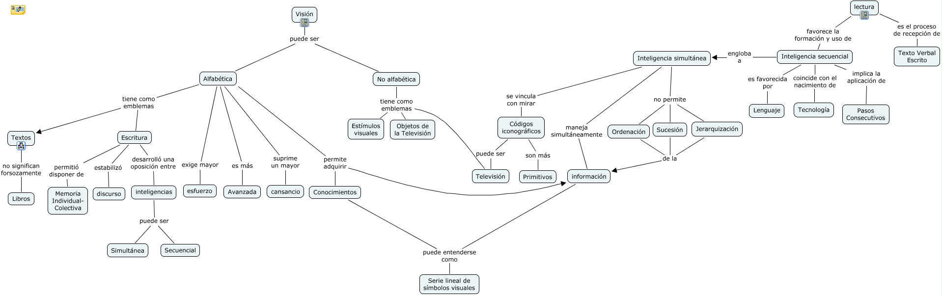 Este Cmap, tiene información relacionada con: Cultura Proposicional-No Proposicional, Alfabética permite adquirir Conocimientos, Inteligencia simultánea se vincula con mirar Códigos iconográficos, Alfabética tiene como emblemas Escritura, Inteligencia secuencial engloba a Inteligencia simultánea, Visión puede ser Alfabética, No alfabética tiene como emblemas Televisión, Visión puede ser No alfabética, Escritura estabilizó discurso, Inteligencia simultánea no permite Ordenación, Inteligencia secuencial implica la aplicación de Pasos Consecutivos, lectura es el proceso de recepción de Texto Verbal Escrito, Inteligencia simultánea no permite Sucesión, Alfabética exige mayor esfuerzo, Sucesión de la información, Jerarquización de la información, Alfabética tiene como emblemas Textos, lectura favorece la formación y uso de Inteligencia secuencial, Alfabética es más Avanzada, inteligencias puede ser Simultánea, No alfabética tiene como emblemas Estímulos visuales