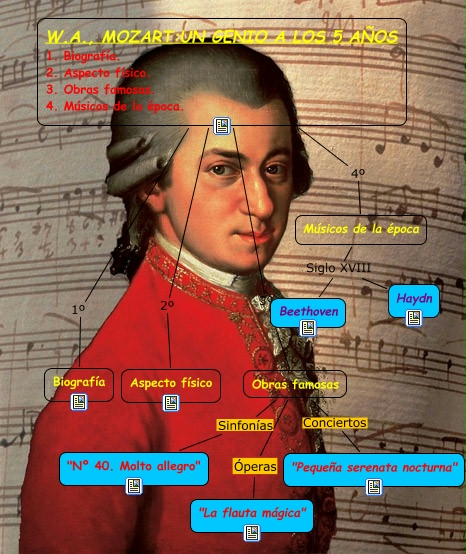 Este Cmap, tiene información relacionada con: CMAP_MOZART_JULIOMULEROGARCÍA, Músicos de la época Siglo XVIII Beethoven, W.A., MOZART:UN GENIO A LOS 5 AÑOS 1. Biografía. 2. Aspecto físico. 3. Obras famosas. 4. Músicos de la época. 1º Biografía, W.A., MOZART:UN GENIO A LOS 5 AÑOS 1. Biografía. 2. Aspecto físico. 3. Obras famosas. 4. Músicos de la época. 4º Músicos de la época, Músicos de la época Siglo XVIII Haydn, W.A., MOZART:UN GENIO A LOS 5 AÑOS 1. Biografía. 2. Aspecto físico. 3. Obras famosas. 4. Músicos de la época. 2º Aspecto físico, Obras famosas Óperas "La flauta mágica", W.A., MOZART:UN GENIO A LOS 5 AÑOS 1. Biografía. 2. Aspecto físico. 3. Obras famosas. 4. Músicos de la época. 3º Obras famosas, Obras famosas Sinfonías "Nº 40. Molto allegro", Obras famosas Conciertos "Pequeña serenata nocturna"