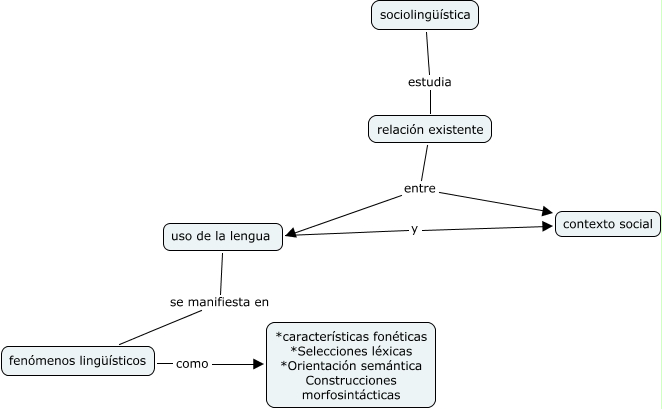 Este Cmap, tiene información relacionada con: Sociolinguistica, sociolingüística estudia relación existente, uso de la lengua y contexto social, fenómenos lingüísticos como *características fonéticas *Selecciones léxicas *Orientación semántica Construcciones morfosintácticas, relación existente entre uso de la lengua, uso de la lengua se manifiesta en fenómenos lingüísticos, relación existente entre contexto social