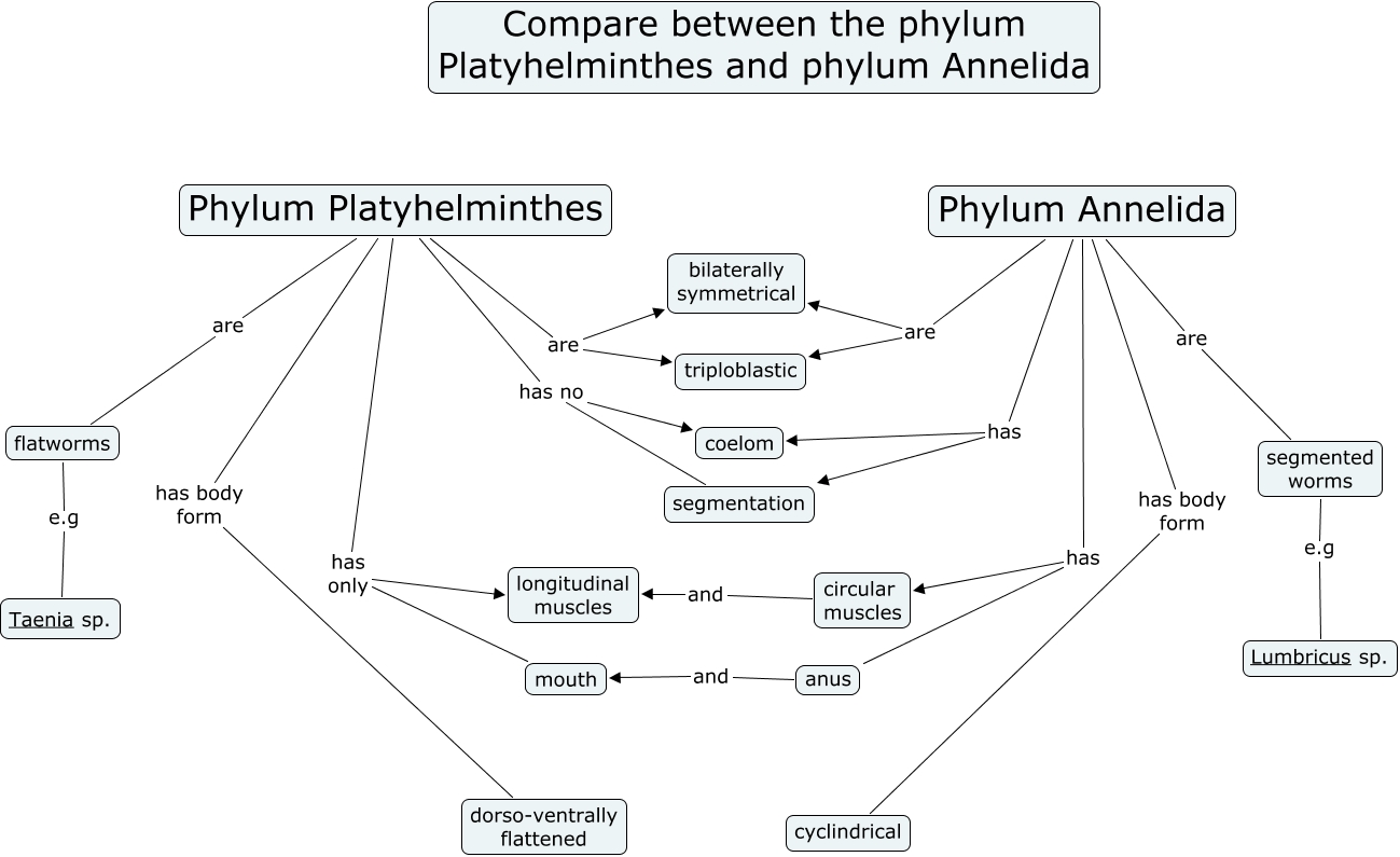 This Concept Map, created with IHMC CmapTools, has information related to: Compare Platyhelminthes & Annelids, Phylum Platyhelminthes has no segmentation, Phylum Annelida are bilaterally symmetrical, segmented worms e.g Lumbricus sp., Phylum Platyhelminthes are bilaterally symmetrical, flatworms e.g Taenia sp., Phylum Platyhelminthes has only longitudinal muscles, Phylum Platyhelminthes has body form dorso-ventrally flattened, Phylum Annelida are triploblastic, Phylum Annelida has coelom, Phylum Annelida are segmented worms, Phylum Platyhelminthes are flatworms, Phylum Annelida has anus, anus and mouth, circular muscles and longitudinal muscles, Phylum Annelida has segmentation, Phylum Annelida has circular muscles, Phylum Annelida has body form cyclindrical, Phylum Platyhelminthes are triploblastic, Phylum Platyhelminthes has no coelom, Phylum Platyhelminthes has only mouth