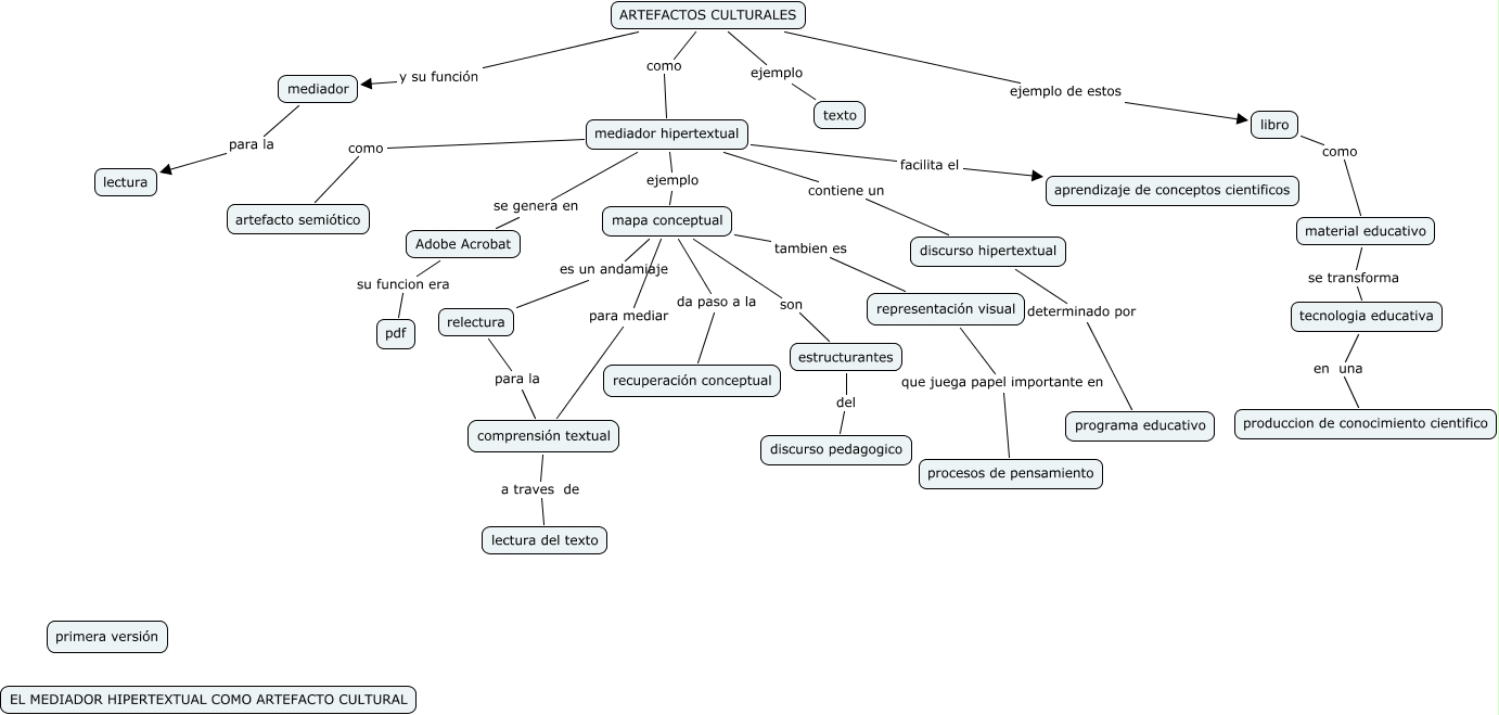 Este Cmap, tiene información relacionada con: artefactos cuturales, libro como material educativo, discurso hipertextual determinado por programa educativo, mediador hipertextual facilita el aprendizaje de conceptos cientificos, mediador hipertextual como artefacto semiótico, mapa conceptual es un andamiaje relectura, relectura para la comprensión textual, mediador para la lectura, ARTEFACTOS CULTURALES y su función mediador, mediador hipertextual contiene un discurso hipertextual, ARTEFACTOS CULTURALES ejemplo texto, ARTEFACTOS CULTURALES ejemplo de estos libro, mapa conceptual para mediar comprensión textual, comprensión textual a traves de lectura del texto, material educativo se transforma tecnologia educativa, Adobe Acrobat su funcion era pdf, mapa conceptual tambien es representación visual, representación visual que juega papel importante en procesos de pensamiento, estructurantes del discurso pedagogico, ARTEFACTOS CULTURALES como mediador hipertextual, mediador hipertextual ejemplo mapa conceptual