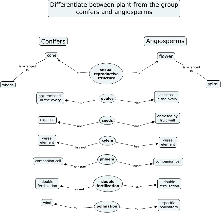 This Concept Map, created with IHMC CmapTools, has information related to: Conifer & angio differentiate, double fertilization has not double fertilization, sexual reproductive structure is flower, phloem has companion cell, flower is arranged in spiral, ovules is enclosed in the ovary, sexual reproductive structure is cone, ovules is not enclosed in the ovary, seeds are enclosed by fruit wall, xylem has vessel element, pollination by wind, cone is arranged in whorls, phloem has not companion cell, xylem has not vessel element, seeds are exposed, double fertilization has double fertilization, pollination by specific pollinators
