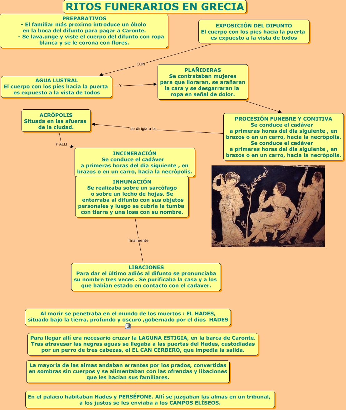 Este Cmap, tiene información relacionada con: Sin Título 2, PROCESIÓN FUNEBRE Y COMITIVA Se conduce el cadáver a primeras horas del dia siguiente , en brazos o en un carro, hacia la necrópolis. Se conduce el cadáver a primeras horas del dia siguiente , en brazos o en un carro, hacia la necrópolis. se dirigía a la ACRÓPOLIS Situada en las afueras de la ciudad., ACRÓPOLIS Situada en las afueras de la ciudad. Y ALLI INCINERACIÓN Se conduce el cadáver a primeras horas del dia siguiente , en brazos o en un carro, hacia la necrópolis., PLAÑIDERAS Se contrataban mujeres para que lloraran, se arañaran la cara y se desgarraran la ropa en señal de dolor. ???? PROCESIÓN FUNEBRE Y COMITIVA Se conduce el cadáver a primeras horas del dia siguiente , en brazos o en un carro, hacia la necrópolis. Se conduce el cadáver a primeras horas del dia siguiente , en brazos o en un carro, hacia la necrópolis., AGUA LUSTRAL El cuerpo con los pies hacia la puerta es expuesto a la vista de todos Y PLAÑIDERAS Se contrataban mujeres para que lloraran, se arañaran la cara y se desgarraran la ropa en señal de dolor., INHUMACIÓN Se realizaba sobre un sarcófago o sobre un lecho de hojas. Se enterraba al difunto con sus objetos personales y luego se cubría la tumba con tierra y una losa con su nombre. finalmente LIBACIONES Para dar el último adiós al difunto se pronunciaba su nombre tres veces . Se purificaba la casa y a los que habían estado en contacto con el cadaver., EXPOSICIÓN DEL DIFUNTO El cuerpo con los pies hacia la puerta es expuesto a la vista de todos CON AGUA LUSTRAL El cuerpo con los pies hacia la puerta es expuesto a la vista de todos