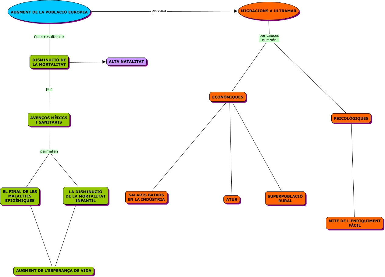 Este Cmap, tiene información relacionada con: REVOLUCIÓ INDUSTRIAL 2, DISMINUCIÓ DE LA MORTALITAT ???? ALTA NATALITAT, AUGMENT DE LA POBLACIÓ EUROPEA provoca MIGRACIONS A ULTRAMAR, AUGMENT DE LA POBLACIÓ EUROPEA és el resultat de DISMINUCIÓ DE LA MORTALITAT, AVENÇOS MÈDICS I SANITARIS permeten LA DISMINUCIÓ DE LA MORTALITAT INFANTIL, MIGRACIONS A ULTRAMAR per causes que són PSICOLÒGIQUES, AVENÇOS MÈDICS I SANITARIS permeten EL FINAL DE LES MALALTIES EPIDÈMIQUES, DISMINUCIÓ DE LA MORTALITAT per AVENÇOS MÈDICS I SANITARIS, ECONÒMIQUES ???? ATUR, LA DISMINUCIÓ DE LA MORTALITAT INFANTIL co AUGMENT DE L'ESPERANÇA DE VIDA, ECONÒMIQUES ???? SUPERPOBLACIÓ RURAL, ECONÒMIQUES ???? SALARIS BAIXOS EN LA INDÚSTRIA, EL FINAL DE LES MALALTIES EPIDÈMIQUES AUGMENT DE L'ESPERANÇA DE VIDA, PSICOLÒGIQUES ???? MITE DE L'ENRIQUIMENT FÀCIL, MIGRACIONS A ULTRAMAR per causes que són ECONÒMIQUES