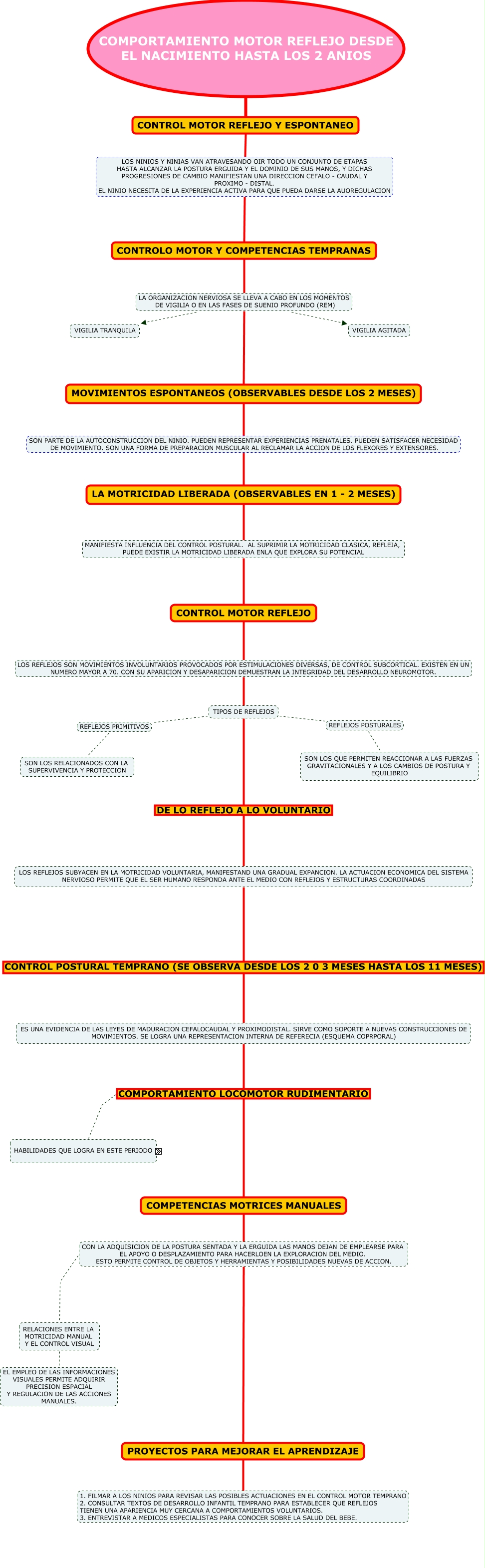 This Concept Map, created with IHMC CmapTools, has information related to: COMPORTAMIENTO MOTOR REFLEJO DESDE EL NACIMIENTO HASTA LOS 2 ANIOS, COMPETENCIAS MOTRICES MANUALES CON LA ADQUISICION DE LA POSTURA SENTADA Y LA ERGUIDA LAS MANOS DEJAN DE EMPLEARSE PARA EL APOYO O DESPLAZAMIENTO PARA HACERLOEN LA EXPLORACION DEL MEDIO. ESTO PERMITE CONTROL DE OBJETOS Y HERRAMIENTAS Y POSIBILIDADES NUEVAS DE ACCION. RELACIONES ENTRE LA MOTRICIDAD MANUAL Y EL CONTROL VISUAL, CONTROLO MOTOR Y COMPETENCIAS TEMPRANAS LA ORGANIZACION NERVIOSA SE LLEVA A CABO EN LOS MOMENTOS DE VIGILIA O EN LAS FASES DE SUENIO PROFUNDO (REM) VIGILIA TRANQUILA, PROYECTOS PARA MEJORAR EL APRENDIZAJE 1. FILMAR A LOS NINIOS PARA REVISAR LAS POSIBLES ACTUACIONES EN EL CONTROL MOTOR TEMPRANO 2. CONSULTAR TEXTOS DE DESARROLLO INFANTIL TEMPRANO PARA ESTABLECER QUE REFLEJOS TIENEN UNA APARIENCIA MUY CERCANA A COMPORTAMIENTOS VOLUNTARIOS. 3. ENTREVISTAR A MEDICOS ESPECIALISTAS PARA CONOCER SOBRE LA SALUD DEL BEBE. ????, CONTROLO MOTOR Y COMPETENCIAS TEMPRANAS LA ORGANIZACION NERVIOSA SE LLEVA A CABO EN LOS MOMENTOS DE VIGILIA O EN LAS FASES DE SUENIO PROFUNDO (REM) VIGILIA AGITADA, CONTROL MOTOR REFLEJO LOS REFLEJOS SON MOVIMIENTOS INVOLUNTARIOS PROVOCADOS POR ESTIMULACIONES DIVERSAS, DE CONTROL SUBCORTICAL. EXISTEN EN UN NUMERO MAYOR A 70. CON SU APARICION Y DESAPARICION DEMUESTRAN LA INTEGRIDAD DEL DESARROLLO NEUROMOTOR. TIPOS DE REFLEJOS, TIPOS DE REFLEJOS DE LO REFLEJO A LO VOLUNTARIO LOS REFLEJOS SUBYACEN EN LA MOTRICIDAD VOLUNTARIA, MANIFESTAND UNA GRADUAL EXPANCION. LA ACTUACION ECONOMICA DEL SISTEMA NERVIOSO PERMITE QUE EL SER HUMANO RESPONDA ANTE EL MEDIO CON REFLEJOS Y ESTRUCTURAS COORDINADAS, CONTROLO MOTOR Y COMPETENCIAS TEMPRANAS LA ORGANIZACION NERVIOSA SE LLEVA A CABO EN LOS MOMENTOS DE VIGILIA O EN LAS FASES DE SUENIO PROFUNDO (REM) MOVIMIENTOS ESPONTANEOS (OBSERVABLES DESDE LOS 2 MESES), MOVIMIENTOS ESPONTANEOS (OBSERVABLES DESDE LOS 2 MESES) SON PARTE DE LA AUTOCONSTRUCCION DEL NINIO. PUEDEN REPRESENTAR EXPERIENCIAS PRENATALES. PUEDEN SATISFACER NECESIDAD DE MOVIMIENTO. SON UNA FORMA DE PREPARACION MUSCULAR AL RECLAMAR LA ACCION DE LOS FLEXORES Y EXTENSORES. LA MOTRICIDAD LIBERADA (OBSERVABLES EN 1 - 2 MESES), TIPOS DE REFLEJOS REFLEJOS POSTURALES SON LOS QUE PERMITEN REACCIONAR A LAS FUERZAS GRAVITACIONALES Y A LOS CAMBIOS DE POSTURA Y EQUILIBRIO, TIPOS DE REFLEJOS REFLEJOS PRIMITIVOS SON LOS RELACIONADOS CON LA SUPERVIVENCIA Y PROTECCION, ES UNA EVIDENCIA DE LAS LEYES DE MADURACION CEFALOCAUDAL Y PROXIMODISTAL. SIRVE COMO SOPORTE A NUEVAS CONSTRUCCIONES DE MOVIMIENTOS. SE LOGRA UNA REPRESENTACION INTERNA DE REFERECIA (ESQUEMA COPRPORAL) COMPORTAMIENTO LOCOMOTOR RUDIMENTARIO COMPETENCIAS MOTRICES MANUALES, RELACIONES ENTRE LA MOTRICIDAD MANUAL Y EL CONTROL VISUAL EL EMPLEO DE LAS INFORMACIONES VISUALES PERMITE ADQUIRIR PRECISION ESPACIAL Y REGULACION DE LAS ACCIONES MANUALES. ????, LA MOTRICIDAD LIBERADA (OBSERVABLES EN 1 - 2 MESES) MANIFIESTA INFLUENCIA DEL CONTROL POSTURAL. AL SUPRIMIR LA MOTRICIDAD CLASICA, REFLEJA, PUEDE EXISTIR LA MOTRICIDAD LIBERADA ENLA QUE EXPLORA SU POTENCIAL CONTROL MOTOR REFLEJO, LOS REFLEJOS SUBYACEN EN LA MOTRICIDAD VOLUNTARIA, MANIFESTAND UNA GRADUAL EXPANCION. LA ACTUACION ECONOMICA DEL SISTEMA NERVIOSO PERMITE QUE EL SER HUMANO RESPONDA ANTE EL MEDIO CON REFLEJOS Y ESTRUCTURAS COORDINADAS CONTROL POSTURAL TEMPRANO (SE OBSERVA DESDE LOS 2 0 3 MESES HASTA LOS 11 MESES) ES UNA EVIDENCIA DE LAS LEYES DE MADURACION CEFALOCAUDAL Y PROXIMODISTAL. SIRVE COMO SOPORTE A NUEVAS CONSTRUCCIONES DE MOVIMIENTOS. SE LOGRA UNA REPRESENTACION INTERNA DE REFERECIA (ESQUEMA COPRPORAL), COMPETENCIAS MOTRICES MANUALES CON LA ADQUISICION DE LA POSTURA SENTADA Y LA ERGUIDA LAS MANOS DEJAN DE EMPLEARSE PARA EL APOYO O DESPLAZAMIENTO PARA HACERLOEN LA EXPLORACION DEL MEDIO. ESTO PERMITE CONTROL DE OBJETOS Y HERRAMIENTAS Y POSIBILIDADES NUEVAS DE ACCION. PROYECTOS PARA MEJORAR EL APRENDIZAJE, CONTROL MOTOR REFLEJO Y ESPONTANEO LOS NINIOS Y NINIAS VAN ATRAVESANDO OIR TODO UN CONJUNTO DE ETAPAS HASTA ALCANZAR LA POSTURA ERGUIDA Y EL DOMINIO DE SUS MANOS, Y DICHAS PROGRESIONES DE CAMBIO MANIFIESTAN UNA DIRECCION CEFALO - CAUDAL Y PROXIMO - DISTAL. EL NINIO NECESITA DE LA EXPERIENCIA ACTIVA PARA QUE PUEDA DARSE LA AUOREGULACION CONTROLO MOTOR Y COMPETENCIAS TEMPRANAS, ES UNA EVIDENCIA DE LAS LEYES DE MADURACION CEFALOCAUDAL Y PROXIMODISTAL. SIRVE COMO SOPORTE A NUEVAS CONSTRUCCIONES DE MOVIMIENTOS. SE LOGRA UNA REPRESENTACION INTERNA DE REFERECIA (ESQUEMA COPRPORAL) COMPORTAMIENTO LOCOMOTOR RUDIMENTARIO HABILIDADES QUE LOGRA EN ESTE PERIODO, COMPORTAMIENTO MOTOR REFLEJO DESDE EL NACIMIENTO HASTA LOS 2 ANIOS ???? CONTROL MOTOR REFLEJO Y ESPONTANEO