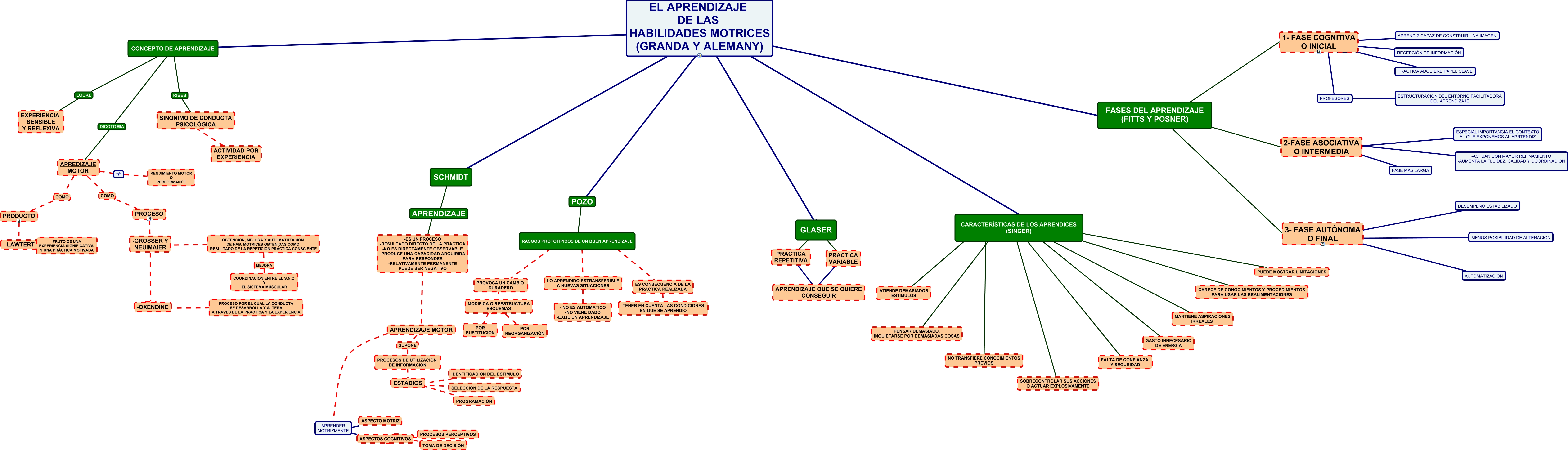 This Concept Map, created with IHMC CmapTools, has information related to: Aprendizaje, EL APRENDIZAJE DE LAS HABILIDADES MOTRICES (GRANDA Y ALEMANY) ???? GLASER, 3- FASE AUTÓNOMA O FINAL ???? MENOS POSIBILIDAD DE ALTERACIÓN, ESTADIOS ???? PROGRAMACIÓN, 1- FASE COGNITIVA O INICIAL ???? APRENDIZ CAPAZ DE CONSTRUIR UNA IMAGEN, ASPECTOS COGNITIVOS ???? TOMA DE DECISIÓN, -GROSSER Y NEUIMAIER ???? OBTENCIÓN, MEJORA Y AUTOMATUZACIÓN DE HAB. MOTRICES OBTENIDAS COMO RESULTADO DE LA REPETICIÓN PRÁCTICA CONSCIENTE, PROCESO ???? -GROSSER Y NEUIMAIER, CARACTERÍSTICAS DE LOS APRENDICES (SINGER) ???? NO TRANSFIERE CONOCIMIENTOS PREVIOS, APRENDIZAJE MOTOR ???? APRENDER MOTRIZMENTE, GLASER ???? PRACTICA REPETITIVA, EL APRENDIZAJE DE LAS HABILIDADES MOTRICES (GRANDA Y ALEMANY) ???? FASES DEL APRENDIZAJE (FITTS Y POSNER), RASGOS PROTOTIPICOS DE UN BUEN APRENDIZAJE ???? PROVOCA UN CAMBIO DURADERO, APREDIZAJE MOTOR ≠ RENDIMIENTO MOTOR O PERFORMANCE, 3- FASE AUTÓNOMA O FINAL ???? DESEMPEÑO ESTABILIZADO, -GROSSER Y NEUIMAIER ???? -OXENDINE, -ES UN PROCESO -RESULTADO DIRECTO DE LA PRÁCTICA -NO ES DIRECTAMENTE OBSERVABLE -PRODUCE UNA CAPACIDAD ADQUIRIDA PARA RESPONDER -RELATIVAMENTE PERMANENTE PUEDE SER NEGATIVO ???? APRENDIZAJE MOTOR, CARACTERÍSTICAS DE LOS APRENDICES (SINGER) ???? PUEDE MOSTRAR LIMITACIONES, ESTADIOS ???? IDENTIFICACIÓN DEL ESTIMULO, CARACTERÍSTICAS DE LOS APRENDICES (SINGER) ???? GASTO INNECESARIO DE ENERGIA, GLASER ???? PRACTICA VARIABLE