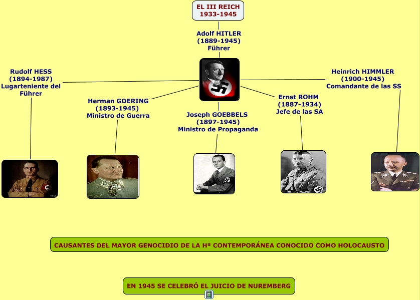 Este Cmap, tiene información relacionada con: HOLOCAUSTO, Heinrich HIMMLER (1900-1945) Comandante de las SS, Ernst ROHM (1887-1934) Jefe de las SA ????, EL III REICH 1933-1945 Adolf HITLER (1889-1945) Führer, Rudolf HESS (1894-1987) Lugarteniente del Führer, Joseph GOEBBELS (1897-1945) Ministro de Propaganda, Herman GOERING (1893-1945) Ministro de Guerra