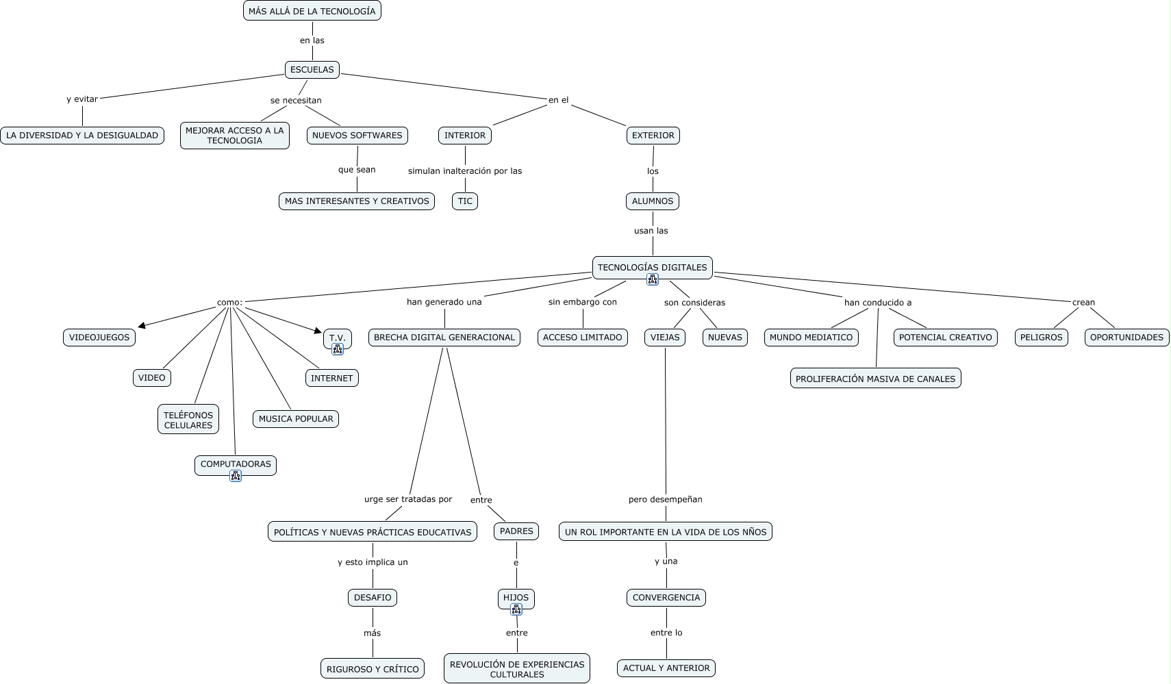 Este Cmap, tiene información relacionada con: MAS ALLÁ DE LA TECNOLOGIA1, INTERIOR simulan inalteración por las TIC, TECNOLOGÍAS DIGITALES sin embargo con ACCESO LIMITADO, ALUMNOS usan las TECNOLOGÍAS DIGITALES, BRECHA DIGITAL GENERACIONAL urge ser tratadas por POLÍTICAS Y NUEVAS PRÁCTICAS EDUCATIVAS, TECNOLOGÍAS DIGITALES han generado una BRECHA DIGITAL GENERACIONAL, ESCUELAS se necesitan NUEVOS SOFTWARES, TECNOLOGÍAS DIGITALES como: MUSICA POPULAR, TECNOLOGÍAS DIGITALES como: VIDEOJUEGOS, TECNOLOGÍAS DIGITALES como: COMPUTADORAS, TECNOLOGÍAS DIGITALES han conducido a MUNDO MEDIATICO, TECNOLOGÍAS DIGITALES son consideras NUEVAS, CONVERGENCIA entre lo ACTUAL Y ANTERIOR, TECNOLOGÍAS DIGITALES como: INTERNET, TECNOLOGÍAS DIGITALES como: TELÉFONOS CELULARES, ESCUELAS se necesitan MEJORAR ACCESO A LA TECNOLOGIA, MÁS ALLÁ DE LA TECNOLOGÍA en las ESCUELAS, TECNOLOGÍAS DIGITALES como: VIDEO, ESCUELAS en el INTERIOR, VIEJAS pero desempeñan UN ROL IMPORTANTE EN LA VIDA DE LOS NÑOS, PADRES e HIJOS