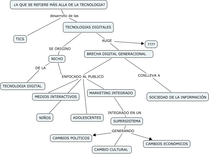 Este Cmap, tiene información relacionada con: MÁS ALLA DE LA TECNOLOGÍA, ¿A QUE SE REFIERE MÁS ALLA DE LA TECNOLOGIA? desarrollo de las TECNOLOGIAS DIGITALES, NICHO DE LA TECNOLOGIA DIGITAL, SUPERSISTEMA GENERANDO CAMBIO CULTURAL, NICHO ENFOCADO AL PUBLICO MEDIOS INTERACTIVOS, TECNOLOGIAS DIGITALES AUGE ????, TECNOLOGIAS DIGITALES SE ORIGINO NICHO, BRECHA DIGITAL GENERACIONAL ENFOCADO AL PUBLICO NIÑOS, ADOLESCENTES ENFOCADO AL PUBLICO MARKETING INTEGRADO, BRECHA DIGITAL GENERACIONAL CONLLEVA A SOCIEDAD DE LA INFORMACIÓN, ADOLESCENTES ENFOCADO AL PUBLICO NIÑOS, NICHO ENFOCADO AL PUBLICO NIÑOS, SUPERSISTEMA GENERANDO CAMBIOS ECONOMICOS, BRECHA DIGITAL GENERACIONAL ENFOCADO AL PUBLICO MEDIOS INTERACTIVOS, SUPERSISTEMA GENERANDO CAMBIOS POLITICOS, ADOLESCENTES ENFOCADO AL PUBLICO MEDIOS INTERACTIVOS, BRECHA DIGITAL GENERACIONAL ENFOCADO AL PUBLICO MARKETING INTEGRADO, MARKETING INTEGRADO INTEGRADO EN UN SUPERSISTEMA, TECNOLOGIAS DIGITALES AUGE BRECHA DIGITAL GENERACIONAL, ¿A QUE SE REFIERE MÁS ALLA DE LA TECNOLOGIA? desarrollo de las TICS, NICHO ENFOCADO AL PUBLICO MARKETING INTEGRADO