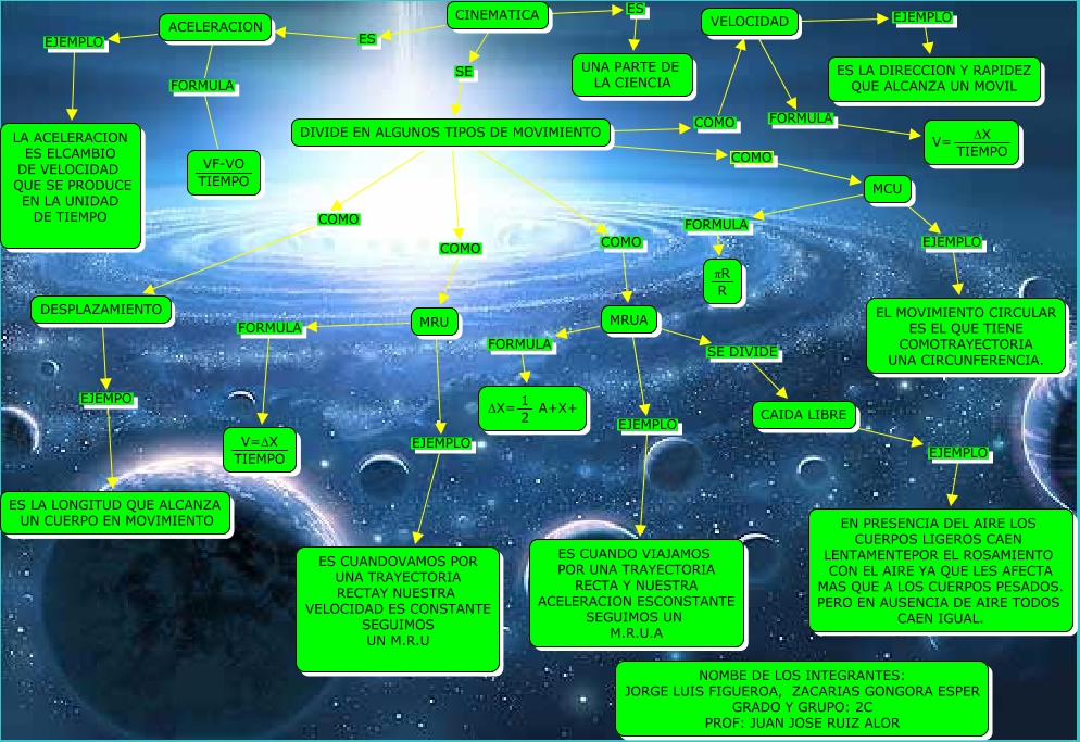 Este Cmap, tiene información relacionada con: JORGE Y ZACARIAS 2C PROF JUAN RUIZ, DIVIDE EN ALGUNOS TIPOS DE MOVIMIENTO COMO MCU, MCU EJEMPLO EL MOVIMIENTO CIRCULAR ES EL QUE TIENE COMOTRAYECTORIA UNA CIRCUNFERENCIA., DIVIDE EN ALGUNOS TIPOS DE MOVIMIENTO COMO MRU, VELOCIDAD FORMULA <math xmlns="http://www.w3.org/1998/Math/MathML"> <mrow> <mtext> V= </mtext> <mfrac> <mtext> ΔX </mtext> <mtext> TIEMPO </mtext> </mfrac> </mrow> </math>, CINEMATICA ES ACELERACION, DIVIDE EN ALGUNOS TIPOS DE MOVIMIENTO COMO MRUA, CINEMATICA ES UNA PARTE DE LA CIENCIA, MCU FORMULA <math xmlns="http://www.w3.org/1998/Math/MathML"> <mrow> <mfrac> <mtext> πR </mtext> <mtext> R </mtext> </mfrac> </mrow> </math>, MRUA EJEMPLO ES CUANDO VIAJAMOS POR UNA TRAYECTORIA RECTA Y NUESTRA ACELERACION ESCONSTANTE SEGUIMOS UN M.R.U.A, MRUA FORMULA <math xmlns="http://www.w3.org/1998/Math/MathML"> <mrow> <mtext> ΔX= </mtext> <mfrac> <mtext> 1 </mtext> <mtext> 2 </mtext> </mfrac> <mtext> A+X+ </mtext> </mrow> </math>, MRU EJEMPLO ES CUANDOVAMOS POR UNA TRAYECTORIA RECTAY NUESTRA VELOCIDAD ES CONSTANTE SEGUIMOS UN M.R.U, DIVIDE EN ALGUNOS TIPOS DE MOVIMIENTO COMO VELOCIDAD, CINEMATICA SE DIVIDE EN ALGUNOS TIPOS DE MOVIMIENTO, ACELERACION FORMULA <math xmlns="http://www.w3.org/1998/Math/MathML"> <mrow> <mfrac> <mtext> VF-VO </mtext> <mtext> TIEMPO </mtext> </mfrac> </mrow> </math>, MRUA SE DIVIDE CAIDA LIBRE, VELOCIDAD EJEMPLO ES LA DIRECCION Y RAPIDEZ QUE ALCANZA UN MOVIL, DIVIDE EN ALGUNOS TIPOS DE MOVIMIENTO COMO DESPLAZAMIENTO, ACELERACION EJEMPLO LA ACELERACION ES ELCAMBIO DE VELOCIDAD QUE SE PRODUCE EN LA UNIDAD DE TIEMPO, MRU FORMULA <math xmlns="http://www.w3.org/1998/Math/MathML"> <mrow> <mfrac> <mtext> V=ΔX </mtext> <mtext> TIEMPO </mtext> </mfrac> </mrow> </math>, CAIDA LIBRE EJEMPLO EN PRESENCIA DEL AIRE LOS CUERPOS LIGEROS CAEN LENTAMENTEPOR EL ROSAMIENTO CON EL AIRE YA QUE LES AFECTA MAS QUE A LOS CUERPOS PESADOS. PERO EN AUSENCIA DE AIRE TODOS CAEN IGUAL.