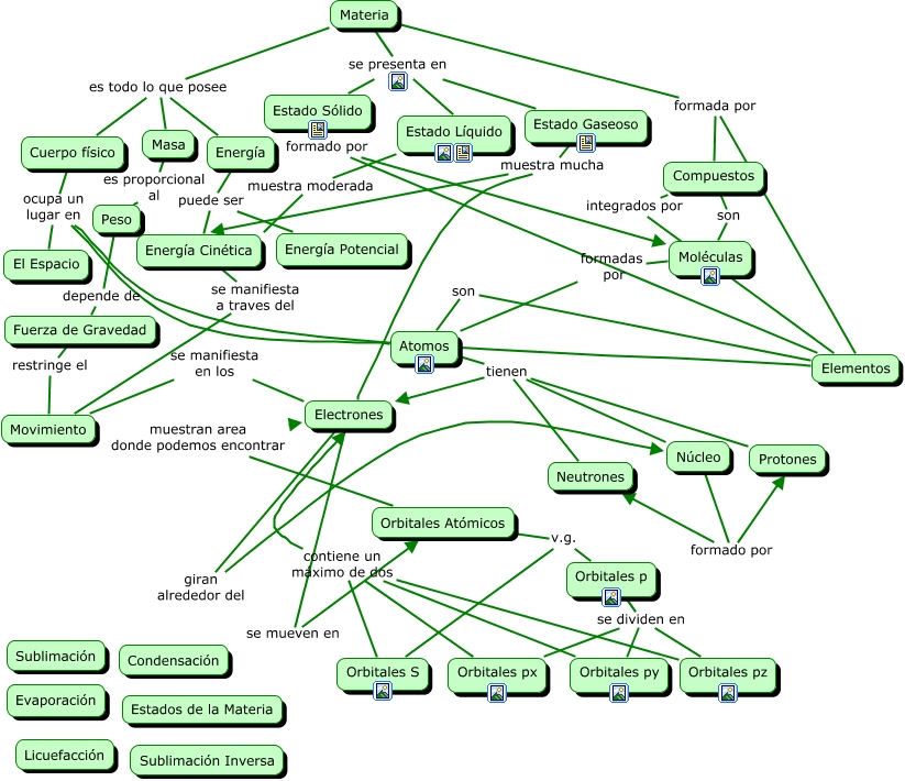Este Cmap, tiene información relacionada con: Materia-06-adibidea, Materia se presenta en Estado Líquido, Elementos ocupa un lugar en El Espacio, Orbitales p se dividen en Orbitales py, Atomos tienen Electrones, Energía puede ser Energía Cinética, Atomos tienen Protones, Núcleo formado por Protones, Electrones giran alrededor del Núcleo, Atomos ocupa un lugar en El Espacio, Electrones muestra mucha Energía Cinética, Materia es todo lo que posee Energía, Núcleo formado por Neutrones, Orbitales Atómicos muestran area donde podemos encontrar Electrones, Estado Sólido formado por Moléculas, Energía puede ser Energía Potencial, Cuerpo físico ocupa un lugar en El Espacio, Orbitales p se dividen en Orbitales px, Energía Cinética se manifiesta a traves del Movimiento, Materia se presenta en Estado Gaseoso, Materia formada por Compuestos