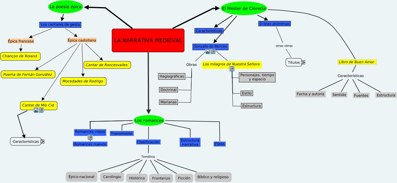 Este Cmap, tiene información relacionada con: La narrativa en la Edad Media2, Títulos otras obras O bras anónimas, LA NARRATIVA MEDIEVAL El Mester de Clerecía Libro de Buen Amor, LA NARRATIVA MEDIEVAL Los romances Estructura narrativa, Cantar de Mío Cid Características Estructura, Gonzalo de Berceo Obras Doctrinal, Libro de Buen Amor Características Fuentes, LA NARRATIVA MEDIEVAL Los romances Clasificación, LA NARRATIVA MEDIEVAL La poesía épica Los cantares de gesta, Libro de Buen Amor Características Sentido, Los cantares de gesta Épica castellana Cantar de Mío Cid, Clasificación Temática Épico-nacional, LA NARRATIVA MEDIEVAL Los romances EStilo, Gonzalo de Berceo Obras Marianas, Los cantares de gesta Épica castellana Cantar de Roncesvalles, Gonzalo de Berceo Los milagros de Nuestra Señora Personajes, tiempo y espacio, LA NARRATIVA MEDIEVAL Los romances Romances nuevos, Cantar de Mío Cid Características Autor, Libro de Buen Amor Características Estructura, LA NARRATIVA MEDIEVAL El Mester de Clerecía O bras anónimas, Clasificación Temática Fronterizo