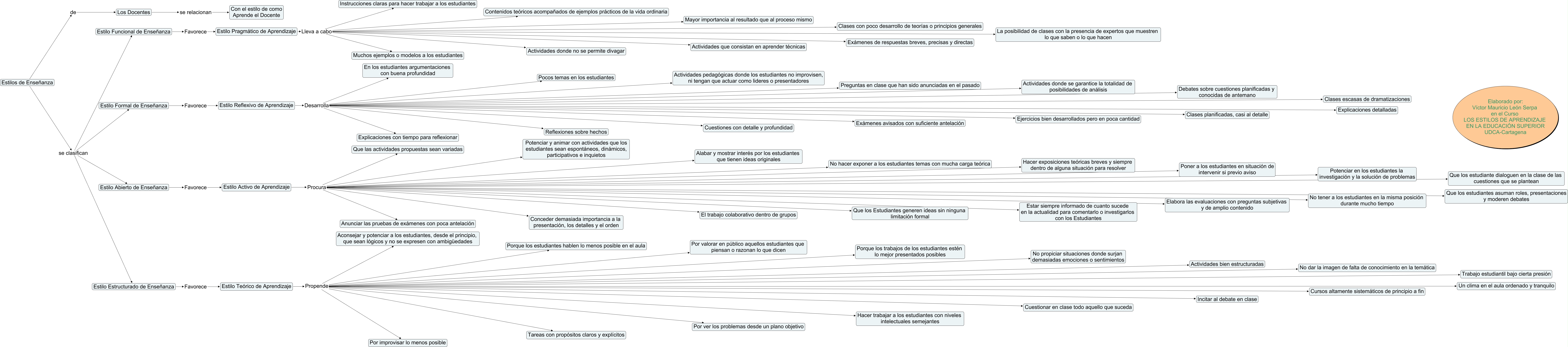 Este Cmap, tiene información relacionada con: Estilos de Enseñanza, Estilo Pragmático de Aprendizaje Lleva a cabo La posibilidad de clases con la presencia de expertos que muestren lo que saben o lo que hacen, Estilo Reflexivo de Aprendizaje Desarrolla Explicaciones detalladas, Estilo Activo de Aprendizaje Procura Estar siempre informado de cuanto sucede en la actualidad para comentarlo o investigarlos con los Estudiantes, Estilos de Enseñanza se clasifican Estilo Abierto de Enseñanza, Estilo Reflexivo de Aprendizaje Desarrolla En los estudiantes argumentaciones con buena profundidad, Estilo Reflexivo de Aprendizaje Desarrolla Ejercicios bien desarrollados pero en poca cantidad, Estilo Activo de Aprendizaje Procura Hacer exposiciones teóricas breves y siempre dentro de alguna situación para resolver, Los Docentes se relacionan Con el estilo de como Aprende el Docente, Estilo Activo de Aprendizaje Procura Alabar y mostrar interés por los estudiantes que tienen ideas originales, Estilo Teórico de Aprendizaje Propende No dar la imagen de falta de conocimiento en la temática, Estilo Reflexivo de Aprendizaje Desarrolla Actividades pedagógicas donde los estudiantes no improvisen, ni tengan que actuar como lideres o presentadores, Estilo Activo de Aprendizaje Procura Potenciar en los estudiantes la investigación y la solución de problemas, Estilo Teórico de Aprendizaje Propende Por improvisar lo menos posible, Estilo Activo de Aprendizaje Procura Anunciar las pruebas de exámenes con poca antelación, Estilo Activo de Aprendizaje Procura Que los estudiantes asuman roles, presentaciones y moderen debates, Estilo Teórico de Aprendizaje Propende Por ver los problemas desde un plano objetivo, Estilo Teórico de Aprendizaje Propende Un clima en el aula ordenado y tranquilo, Estilo Teórico de Aprendizaje Propende Cursos altamente sistemáticos de principio a fin, Estilo Pragmático de Aprendizaje Lleva a cabo Actividades que consistan en aprender técnicas, Estilo Teórico de Aprendizaje Propende Cuestionar en clase todo aquello que suceda