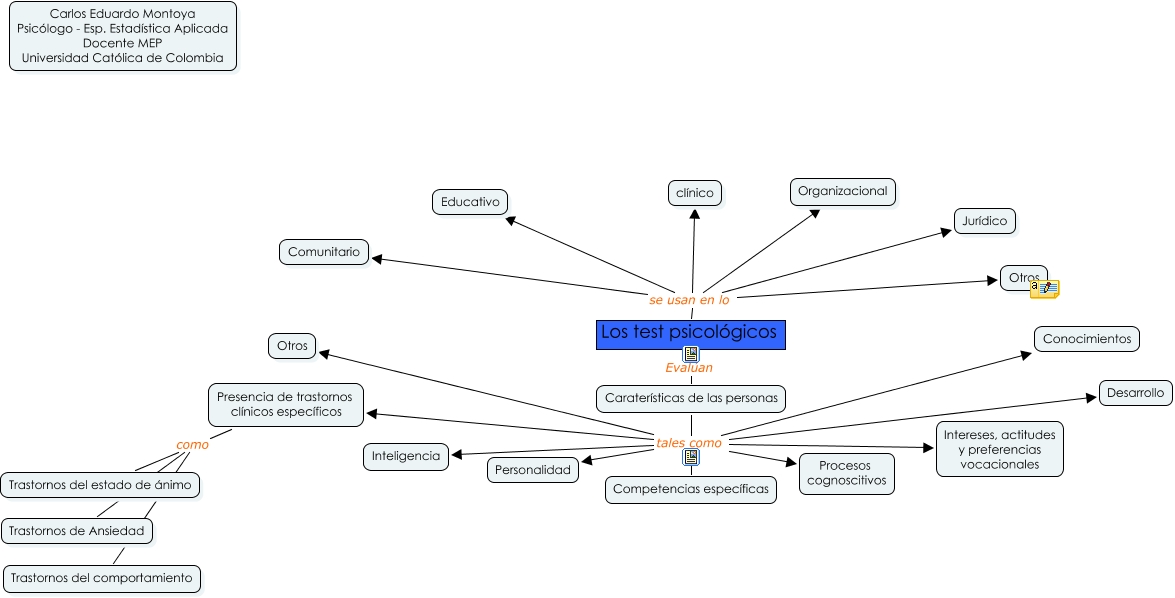 Este Cmap, tiene información relacionada con: Test psicológicos, Caraterísticas de las personas tales como Competencias específicas, Caraterísticas de las personas tales como Presencia de trastornos clínicos específicos, Los test psicológicos Evalúan Caraterísticas de las personas, Los test psicológicos se usan en lo Jurídico, Caraterísticas de las personas tales como Intereses, actitudes y preferencias vocacionales, Los test psicológicos se usan en lo Organizacional, Caraterísticas de las personas tales como Inteligencia, Caraterísticas de las personas tales como Otros, Presencia de trastornos clínicos específicos como Trastornos del estado de ánimo, Los test psicológicos se usan en lo clínico, Presencia de trastornos clínicos específicos como Trastornos de Ansiedad, Caraterísticas de las personas tales como Procesos cognoscitivos, Los test psicológicos se usan en lo Comunitario, Los test psicológicos se usan en lo Educativo, Caraterísticas de las personas tales como Conocimientos, Caraterísticas de las personas tales como Desarrollo, Caraterísticas de las personas tales como Personalidad, Los test psicológicos se usan en lo Otros, Presencia de trastornos clínicos específicos como Trastornos del comportamiento