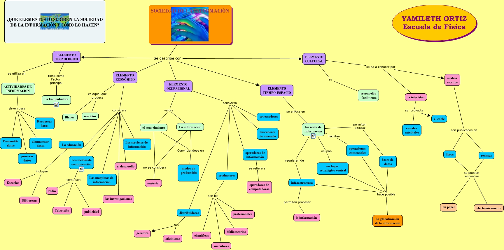 Este Cmap, tiene información relacionada con: Sociedad de la información, libros se pueden encontrar electronicamente, ELEMENTO TIEMPO-ESPACIO se enfoca en las redes de informaciòn, ELEMENTO ECONÓMICO considera Las maquinas de información, ELEMENTO ECONÓMICO considera La educación, libros se pueden encontrar en papel, la televisiòn se proyecta el cable, ACTIVIDADES DE INFORMACIÓN sirven para alamacenar datos, ELEMENTO ECONÓMICO considera el desarrollo, infraestructura permiten procesar la informaciòn, el conocimiento Convirtiendose en modos de producciòn, SOCIEDAD DE LA INFORMACIÓN Se describe con ELEMENTO ECONÓMICO, ELEMENTO OCUPACIONAL considera operadores de informaciòn, SOCIEDAD DE LA INFORMACIÓN Se describe con ELEMENTO TIEMPO-ESPACIO, infraestructura hace posible La globalizaciòn de la informaciòn, las redes de informaciòn permiten utilizar bases de datos, productores son los bibliotecarios, SOCIEDAD DE LA INFORMACIÓN Se describe con ELEMENTO TECNOLÓGICO, ELEMENTO ECONÓMICO considera Los medios de comunicación, La información no se considera material, la televisiòn se proyecta canales satelitales