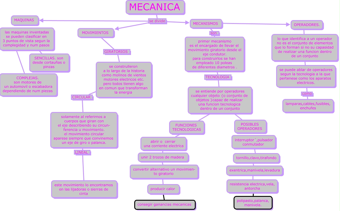 Este Cmap, tiene información relacionada con: Eq17 Mecanica, unir 2 trozos de madera ???? convertir alternativo un movimien- to giratorio, se entiende por operadores cualquier objeto {o conjunto de objetos }capaz de realizar una funcion tecnologica dentro de un conjunto ???? POSIBLES OPERADORES, tornillo,clavo,tirafondo ???? exentrica,manivela,levadura, convertir alternativo un movimien- to giratorio ???? producir calor, MECANICA se divide MAQUINAS, MECANISMOS son primer mecanismo es el encargado de llevar el movimiento giratorio desde el eje condutor. para construirlos se han empleado 10 poleas de diferentes diametros ., producir calor ???? consegir ganancias mecanicas, MECANICA se divide MOVIMIENTOS, se construlleron a lo largo de la historia como molinos de vientos motores electricos etc. pero todos tienen algo en comun que transforman la energia CIRCULAR solamente al referirnos a cuerpos que giran con el eje describiendo su circun- ferencia u movimiento. el movimiento circular aparese siempre que convinemos un eje de giro o palanca., MECANICA se divide MECANISMOS, abrir o cerrar una corriente electrica ???? unir 2 trozos de madera, primer mecanismo es el encargado de llevar el movimiento giratorio desde el eje condutor. para construirlos se han empleado 10 poleas de diferentes diametros . TECNOLOGIA se entiende por operadores cualquier objeto {o conjunto de objetos }capaz de realizar una funcion tecnologica dentro de un conjunto, FUNCIONES TECNOLOGICAS ???? abrir o cerrar una corriente electrica, resistencia electrica,vela, antorcha ???? polipasto,palanca, manivela., OPERADORES. ???? lo que identifica a un operador no es el conjunto de elementos que lo forman si no su capasidad de realizar una funcion dentro de un conjunto, se puede ablar de operadores segun la tecnologia a la que pertenese como los aparatos electricos. como lamparas,cables,fusibles, enchufes, se entiende por operadores cualquier objeto {o conjunto de objetos }capaz de realizar una funcion tecnologica dentro de un conjunto ???? FUNCIONES TECNOLOGICAS, las maquinas inventadas se pueden clasificar en 3 puntos de vista segun la complegidad y num pasos ???? COMPLEJAS. son motores de un automovil o escabadora dependiendo de num piezas, interruptor´,pulsador conmutador ???? tornillo,clavo,tirafondo, exentrica,manivela,levadura ???? resistencia electrica,vela, antorcha