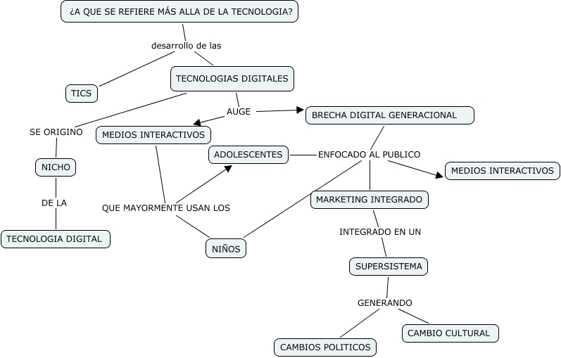 Este Cmap, tiene información relacionada con: MÁS ALLA DE LA TECNOLOGÍA, MARKETING INTEGRADO INTEGRADO EN UN SUPERSISTEMA, SUPERSISTEMA GENERANDO CAMBIOS POLITICOS, ¿A QUE SE REFIERE MÁS ALLA DE LA TECNOLOGIA? desarrollo de las TECNOLOGIAS DIGITALES, TECNOLOGIAS DIGITALES AUGE MEDIOS INTERACTIVOS, ADOLESCENTES ENFOCADO AL PUBLICO MARKETING INTEGRADO, BRECHA DIGITAL GENERACIONAL ENFOCADO AL PUBLICO MEDIOS INTERACTIVOS, MEDIOS INTERACTIVOS QUE MAYORMENTE USAN LOS NIÑOS, BRECHA DIGITAL GENERACIONAL ENFOCADO AL PUBLICO NIÑOS, TECNOLOGIAS DIGITALES SE ORIGINO NICHO, SUPERSISTEMA GENERANDO CAMBIO CULTURAL, MEDIOS INTERACTIVOS QUE MAYORMENTE USAN LOS ADOLESCENTES, NICHO DE LA TECNOLOGIA DIGITAL, ADOLESCENTES ENFOCADO AL PUBLICO MEDIOS INTERACTIVOS, BRECHA DIGITAL GENERACIONAL ENFOCADO AL PUBLICO MARKETING INTEGRADO, ADOLESCENTES ENFOCADO AL PUBLICO NIÑOS, ¿A QUE SE REFIERE MÁS ALLA DE LA TECNOLOGIA? desarrollo de las TICS, TECNOLOGIAS DIGITALES AUGE BRECHA DIGITAL GENERACIONAL