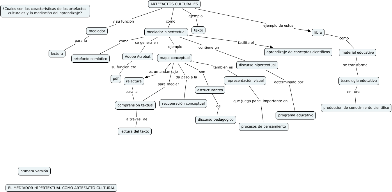 Este Cmap, tiene información relacionada con: artefactos cuturales, libro como material educativo, discurso hipertextual determinado por programa educativo, mediador hipertextual como artefacto semiótico, mediador hipertextual facilita el aprendizaje de conceptos cientificos, mapa conceptual es un andamiaje relectura, relectura para la comprensión textual, mediador para la lectura, ARTEFACTOS CULTURALES y su función mediador, mediador hipertextual contiene un discurso hipertextual, mapa conceptual para mediar comprensión textual, ARTEFACTOS CULTURALES ejemplo de estos libro, ARTEFACTOS CULTURALES ejemplo texto, Adobe Acrobat su funcion era pdf, material educativo se transforma tecnologia educativa, comprensión textual a traves de lectura del texto, mapa conceptual tambien es representación visual, representación visual que juega papel importante en procesos de pensamiento, estructurantes del discurso pedagogico, ARTEFACTOS CULTURALES como mediador hipertextual, mapa conceptual da paso a la recuperación conceptual