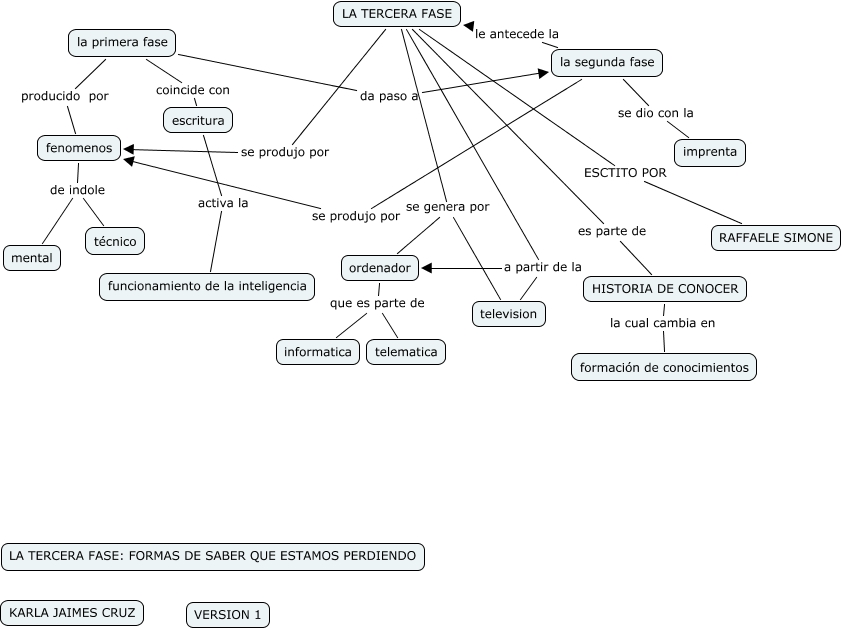 Este Cmap, tiene información relacionada con: LA TERCERA FASE, la segunda fase se produjo por fenomenos, la primera fase coincide con escritura, LA TERCERA FASE se produjo por fenomenos, LA TERCERA FASE se genera por television, LA TERCERA FASE a partir de la ordenador, la primera fase producido por fenomenos, fenomenos de indole técnico, HISTORIA DE CONOCER la cual cambia en formación de conocimientos, la segunda fase se dio con la imprenta, LA TERCERA FASE ESCTITO POR RAFFAELE SIMONE, la segunda fase le antecede la LA TERCERA FASE, LA TERCERA FASE a partir de la television, escritura activa la funcionamiento de la inteligencia, ordenador que es parte de telematica, fenomenos de indole mental, ordenador que es parte de informatica, la primera fase da paso a la segunda fase, LA TERCERA FASE se genera por ordenador, LA TERCERA FASE es parte de HISTORIA DE CONOCER