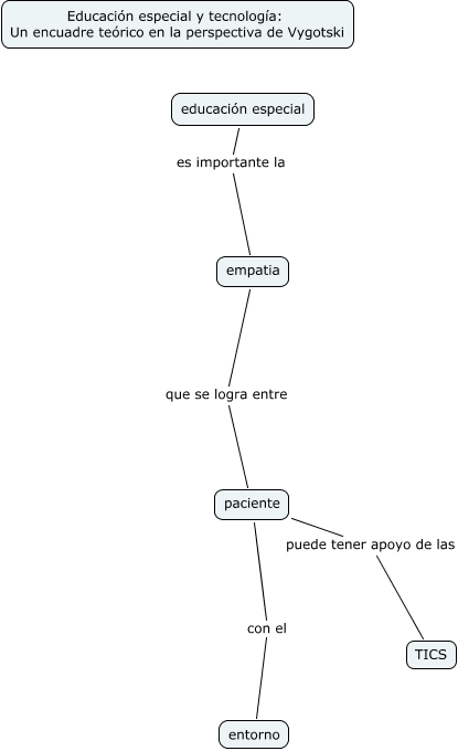 Este Cmap, tiene información relacionada con: Educacion especial y tecnologia un encuadre teórico, educación especial es importante la empatia, empatia que se logra entre paciente, paciente con el entorno, paciente puede tener apoyo de las TICS