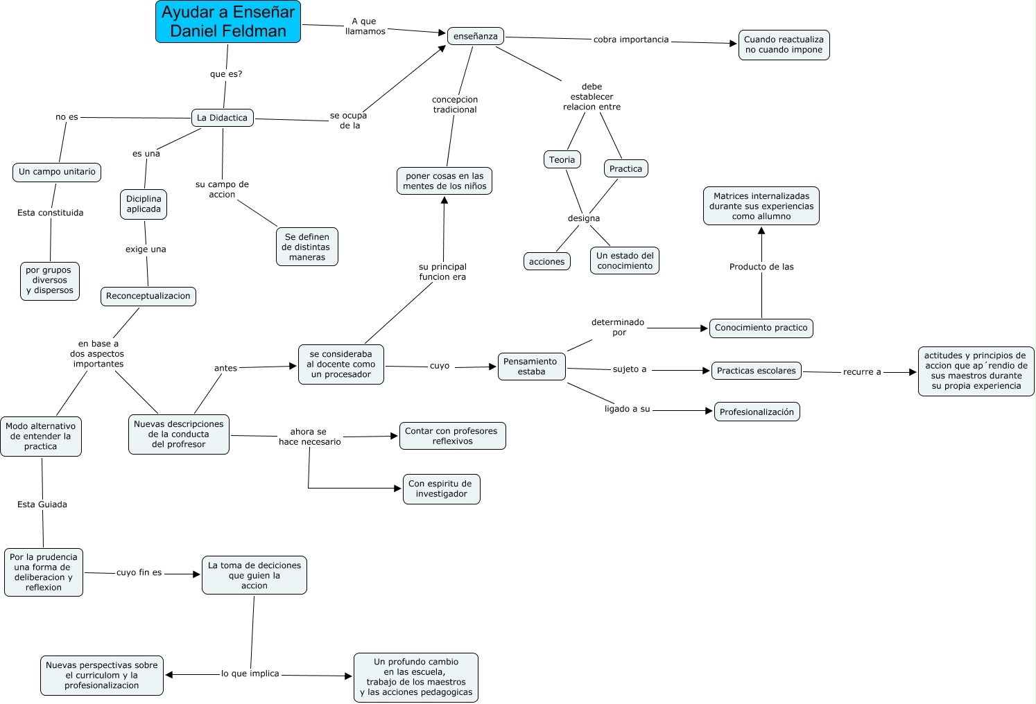 Este Cmap, tiene información relacionada con: Daniel feldman Ayuda a Enseñar, Nuevas descripciones de la conducta del profresor ahora se hace necesario Contar con profesores reflexivos, Pensamiento estaba ligado a su Profesionalización, Nuevas descripciones de la conducta del profresor antes se consideraba al docente como un procesador, enseñanza cobra importancia Cuando reactualiza no cuando impone, Un campo unitario Esta constituida por grupos diversos y dispersos, se consideraba al docente como un procesador cuyo Pensamiento estaba, Modo alternativo de entender la practica Esta Guiada Por la prudencia una forma de deliberacion y reflexion, La Didactica se ocupa de la enseñanza, enseñanza debe establecer relacion entre Teoria, Practica designa acciones, Pensamiento estaba determinado por Conocimiento practico, Por la prudencia una forma de deliberacion y reflexion cuyo fin es La toma de deciciones que guien la accion, La toma de deciciones que guien la accion lo que implica Nuevas perspectivas sobre el curriculom y la profesionalizacion, Teoria designa acciones, La Didactica no es Un campo unitario, enseñanza concepcion tradicional poner cosas en las mentes de los niños, Teoria designa Un estado del conocimiento, Diciplina aplicada exige una Reconceptualizacion, Practicas escolares recurre a actitudes y principios de accion que ap´rendio de sus maestros durante su propia experiencia, Pensamiento estaba sujeto a Practicas escolares