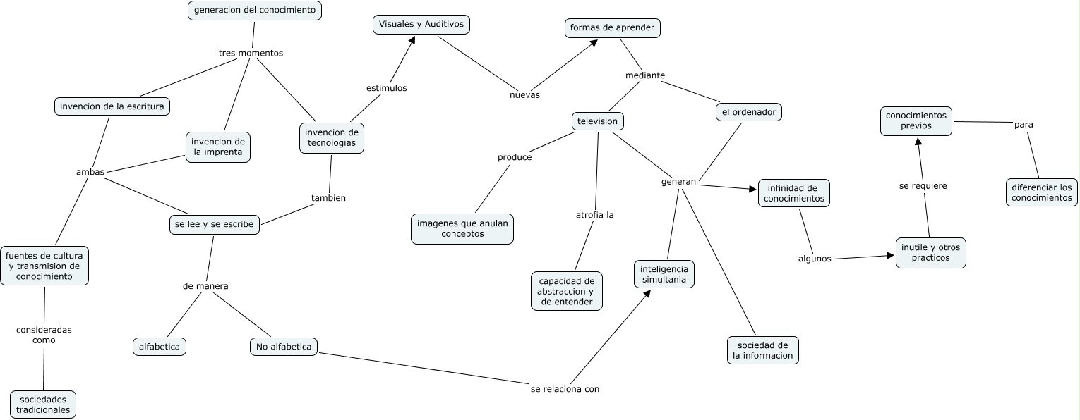 Este Cmap, tiene información relacionada con: simone trecera face, generacion del conocimiento tres momentos invencion de la escritura, invencion de la imprenta ambas se lee y se escribe, se lee y se escribe de manera No alfabetica, el ordenador generan inteligencia simultania, el ordenador generan infinidad de conocimientos, el ordenador generan sociedad de la informacion, infinidad de conocimientos algunos inutile y otros practicos, se lee y se escribe de manera alfabetica, No alfabetica se relaciona con inteligencia simultania, fuentes de cultura y transmision de conocimiento consideradas como sociedades tradicionales, invencion de tecnologias estimulos Visuales y Auditivos, invencion de la escritura ambas se lee y se escribe, invencion de la imprenta ambas fuentes de cultura y transmision de conocimiento, invencion de la escritura ambas fuentes de cultura y transmision de conocimiento, generacion del conocimiento tres momentos invencion de tecnologias, generacion del conocimiento tres momentos invencion de la imprenta, formas de aprender mediante el ordenador, formas de aprender mediante television, inutile y otros practicos se requiere conocimientos previos, television generan infinidad de conocimientos