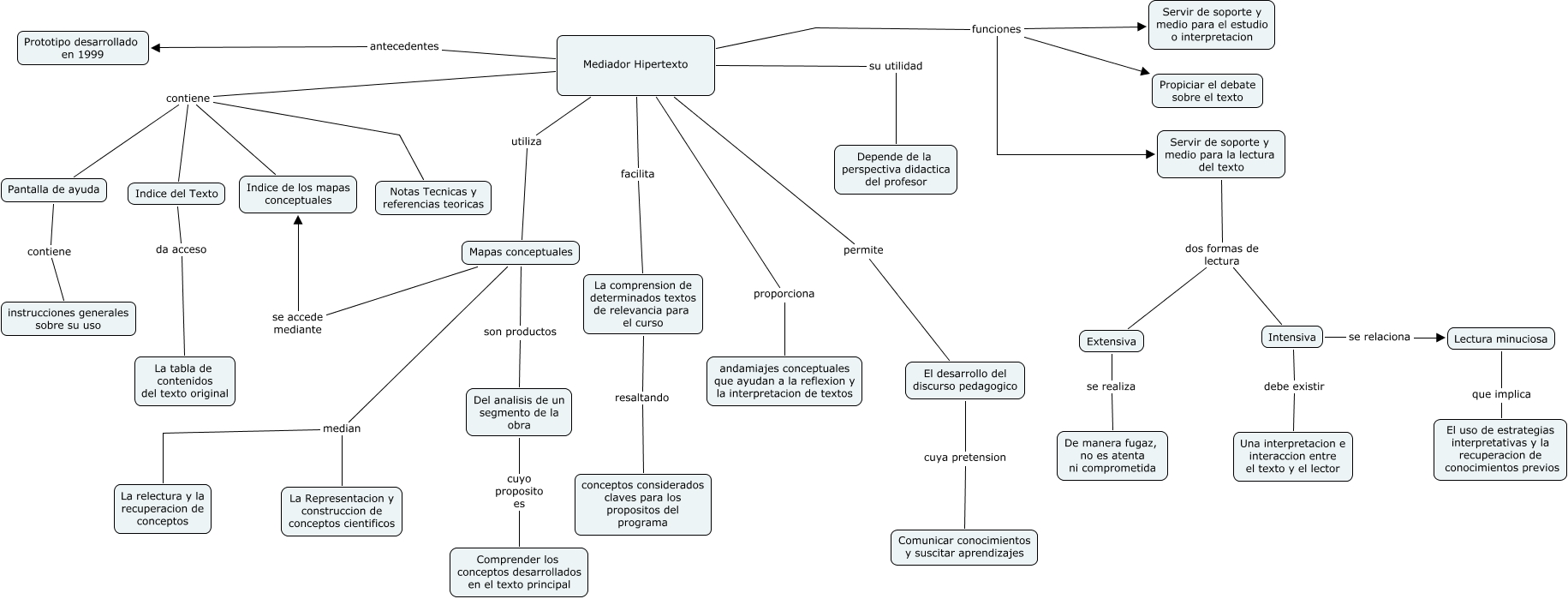 Este Cmap, tiene información relacionada con: Mediador Hipertexto, Intensiva se relaciona Lectura minuciosa, Intensiva debe existir Una interpretacion e interaccion entre el texto y el lector, Mediador Hipertexto contiene Indice del Texto, Mediador Hipertexto su utilidad Depende de la perspectiva didactica del profesor, Extensiva se realiza De manera fugaz, no es atenta ni comprometida, La comprension de determinados textos de relevancia para el curso resaltando conceptos considerados claves para los propositos del programa, Mediador Hipertexto contiene Notas Tecnicas y referencias teoricas, Lectura minuciosa que implica El uso de estrategias interpretativas y la recuperacion de conocimientos previos, Del analisis de un segmento de la obra cuyo proposito es Comprender los conceptos desarrollados en el texto principal, Mediador Hipertexto permite El desarrollo del discurso pedagogico, Mediador Hipertexto funciones Servir de soporte y medio para el estudio o interpretacion, Mediador Hipertexto contiene Indice de los mapas conceptuales, Mediador Hipertexto facilita La comprension de determinados textos de relevancia para el curso, Mapas conceptuales median La relectura y la recuperacion de conceptos, Mediador Hipertexto funciones Propiciar el debate sobre el texto, Mediador Hipertexto contiene Pantalla de ayuda, Servir de soporte y medio para la lectura del texto dos formas de lectura Extensiva, Mediador Hipertexto proporciona andamiajes conceptuales que ayudan a la reflexion y la interpretacion de textos, Mapas conceptuales se accede mediante Indice de los mapas conceptuales, Indice del Texto da acceso La tabla de contenidos del texto original