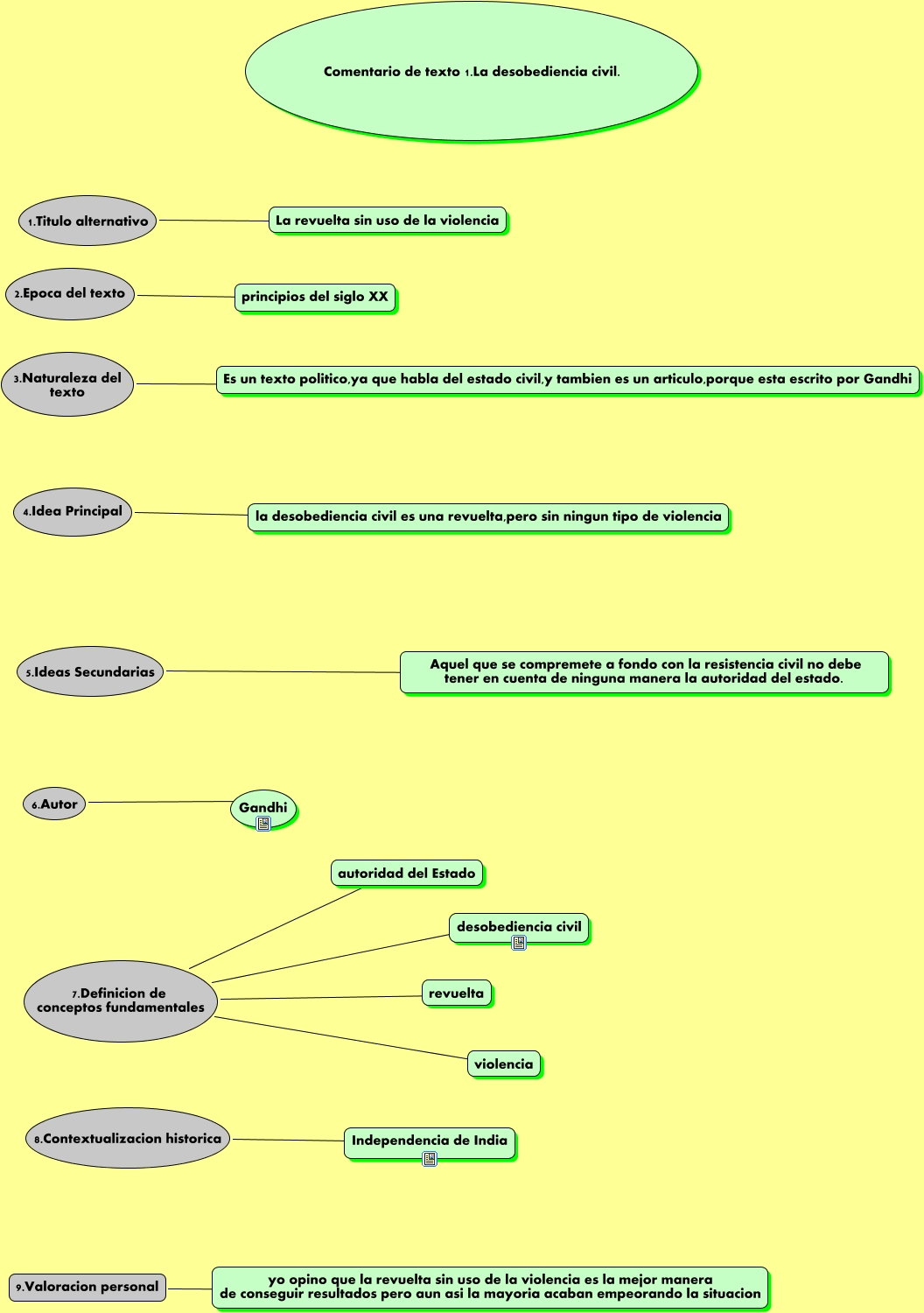 Cette carte conceptuelle, cree avec IHMC CmapTools, contient des informations liees a : comentario de texto 1.desobediencia social, 8.Contextualizacion historica ???? Independencia de India, 1.Titulo alternativo ???? La revuelta sin uso de la violencia, 5.Ideas Secundarias ???? Aquel que se compremete a fondo con la resistencia civil no debe tener en cuenta de ninguna manera la autoridad del estado., 7.Definicion de conceptos fundamentales ???? revuelta, 2.Epoca del texto ???? principios del siglo XX, 4.Idea Principal ???? la desobediencia civil es una revuelta,pero sin ningun tipo de violencia, 9.Valoracion personal ???? yo opino que la revuelta sin uso de la violencia es la mejor manera de conseguir resultados pero aun asi la mayoria acaban empeorando la situacion, 7.Definicion de conceptos fundamentales ???? violencia, 7.Definicion de conceptos fundamentales ???? desobediencia civil, 3.Naturaleza del texto ???? Es un texto politico,ya que habla del estado civil,y tambien es un articulo,porque esta escrito por Gandhi, 7.Definicion de conceptos fundamentales ???? autoridad del Estado, 6.Autor ???? Gandhi