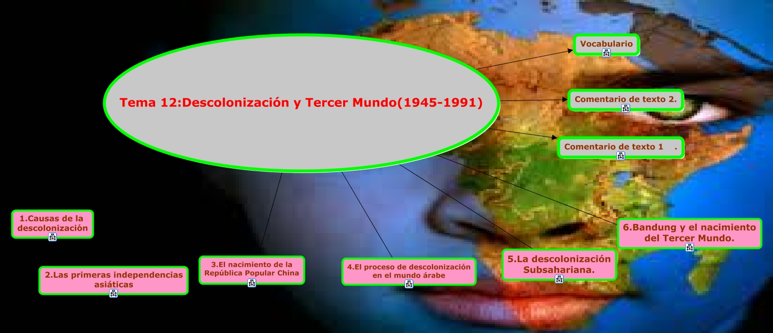 Cette carte conceptuelle, cree avec IHMC CmapTools, contient des informations liees a : indice tema 12, Tema 12:Descolonización y Tercer Mundo(1945-1991) ???? 6.Bandung y el nacimiento del Tercer Mundo., Tema 12:Descolonización y Tercer Mundo(1945-1991) ???? 2.Las primeras independencias asiáticas, Tema 12:Descolonización y Tercer Mundo(1945-1991) ???? Comentario de texto 2., Tema 12:Descolonización y Tercer Mundo(1945-1991) ???? 3.El nacimiento de la República Popular China, Tema 12:Descolonización y Tercer Mundo(1945-1991) ???? 5.La descolonización Subsahariana., Tema 12:Descolonización y Tercer Mundo(1945-1991) ???? 4.El proceso de descolonización en el mundo árabe, Tema 12:Descolonización y Tercer Mundo(1945-1991) ???? 1.Causas de la descolonización, Tema 12:Descolonización y Tercer Mundo(1945-1991) ???? Comentario de texto 1 ., Tema 12:Descolonización y Tercer Mundo(1945-1991) ???? Vocabulario