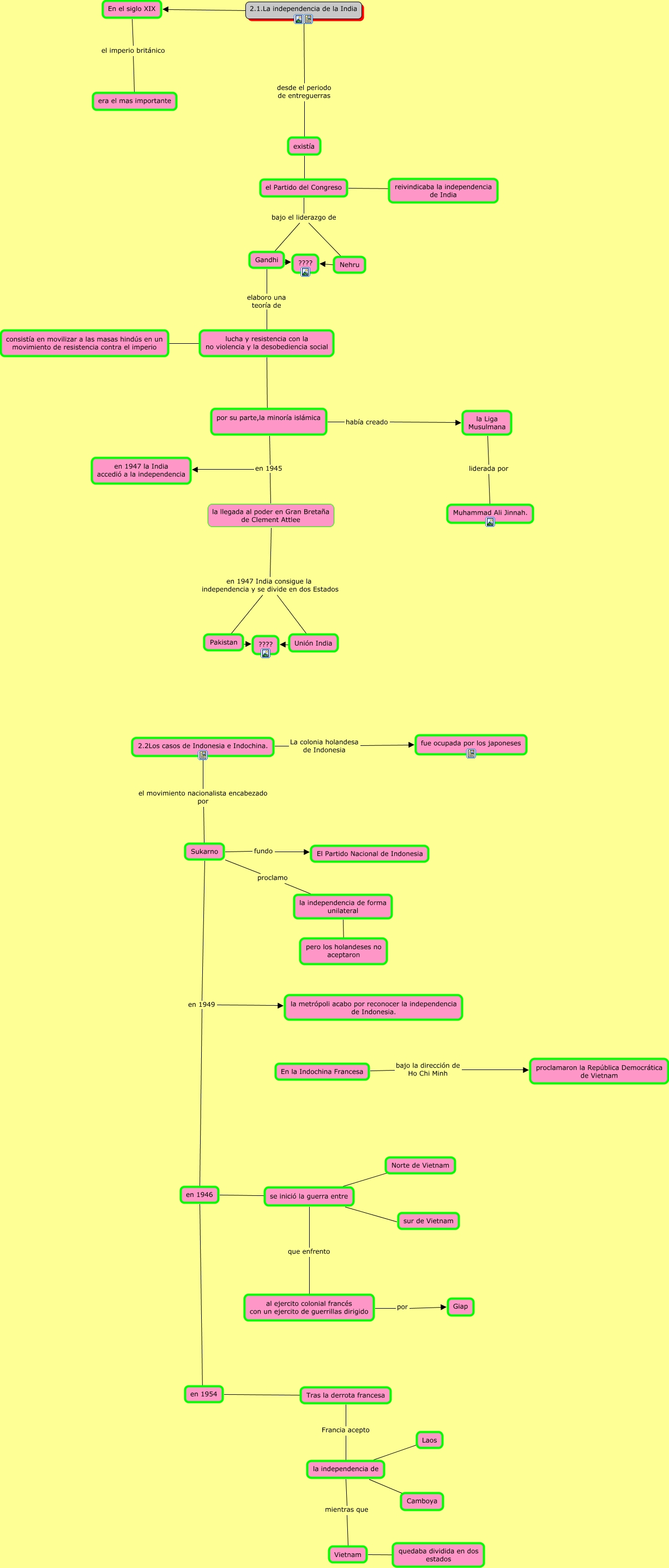Cette carte conceptuelle, cree avec IHMC CmapTools, contient des informations liees a : tema 12 punto 2, Sukarno proclamo la independencia de forma unilateral, Gandhi elaboro una teoría de lucha y resistencia con la no violencia y la desobediencia social, se inició la guerra entre que enfrento al ejercito colonial francés con un ejercito de guerrillas dirigido, 2.2Los casos de Indonesia e Indochina. el movimiento nacionalista encabezado por Sukarno, la Liga Musulmana liderada por Muhammad Ali Jinnah., en 1946 ???? se inició la guerra entre, en 1954 ???? Tras la derrota francesa, la independencia de ???? Laos, Sukarno en 1949 la metrópoli acabo por reconocer la independencia de Indonesia., existía ???? el Partido del Congreso, en 1946 ???? en 1954, la independencia de forma unilateral ???? pero los holandeses no aceptaron, Nehru ???? ????, por su parte,la minoría islámica en 1945 la llegada al poder en Gran Bretaña de Clement Attlee, lucha y resistencia con la no violencia y la desobediencia social ???? por su parte,la minoría islámica, el Partido del Congreso bajo el liderazgo de Gandhi, el Partido del Congreso bajo el liderazgo de Nehru, 2.1.La independencia de la India desde el periodo de entreguerras existía, Gandhi ???? ????, la llegada al poder en Gran Bretaña de Clement Attlee en 1947 India consigue la independencia y se divide en dos Estados Pakistan