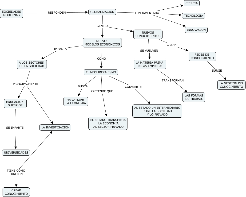 Este Cmap, tiene información relacionada con: GLOBALIZACION Y EDUCACION, NUEVOS CONOCIMIENTOS SE VUELVEN LA MATERIA PRIMA EN LAS EMPRESAS, EDUCACION SUPERIOR SE IMPARTE UNIVERSIDADES, LA MATERIA PRIMA EN LAS EMPRESAS TRANSFORMAN LAS FORMAS DE TRABAJO, UNIVERSIDADES TIENE COMO FUNCION LA INVESTIGACION, GLOBALIZACION FUNDAMENTADA INNOVACION, EL NEOLIBERALISMO PRETENDE QUE EL ESTADO TRANSFIERA LA ECONOMIA AL SECTOR PRIVADO, NUEVOS MODELOS ECONOMICOS COMO EL NEOLIBERALISMO, GLOBALIZACION GENERA NUEVOS MODELOS ECONOMICOS, NUEVOS MODELOS ECONOMICOS IMPACTA A LOS SECTORES DE LA SOCIEDAD, GLOBALIZACION FUNDAMENTADA CIENCIA, A LOS SECTORES DE LA SOCIEDAD PRINCIPALMENTE EDUCACION SUPERIOR, GLOBALIZACION GENERA NUEVOS CONOCIMIENTOS, UNIVERSIDADES TIENE COMO FUNCION CREAR CONOCIMIENTO, EL NEOLIBERALISMO CONVIERTE AL ESTADO UN INTERMEDIARIO ENTRE LA SOCIEDAD Y LO PRIVADO, NUEVOS CONOCIMIENTOS CREAN REDES DE CONOCIMIENTO, GLOBALIZACION FUNDAMENTADA TECNOLOGIA, SOCIEDADES MODERNAS RESPONDEN GLOBALIZACION, EL NEOLIBERALISMO BUSCA PRIVATIZAR LA ECONOMIA, A LOS SECTORES DE LA SOCIEDAD PRINCIPALMENTE LA INVESTIGACION, REDES DE CONOCIMIENTO SURGE LA GESTION DEL CONOCIMIENTO