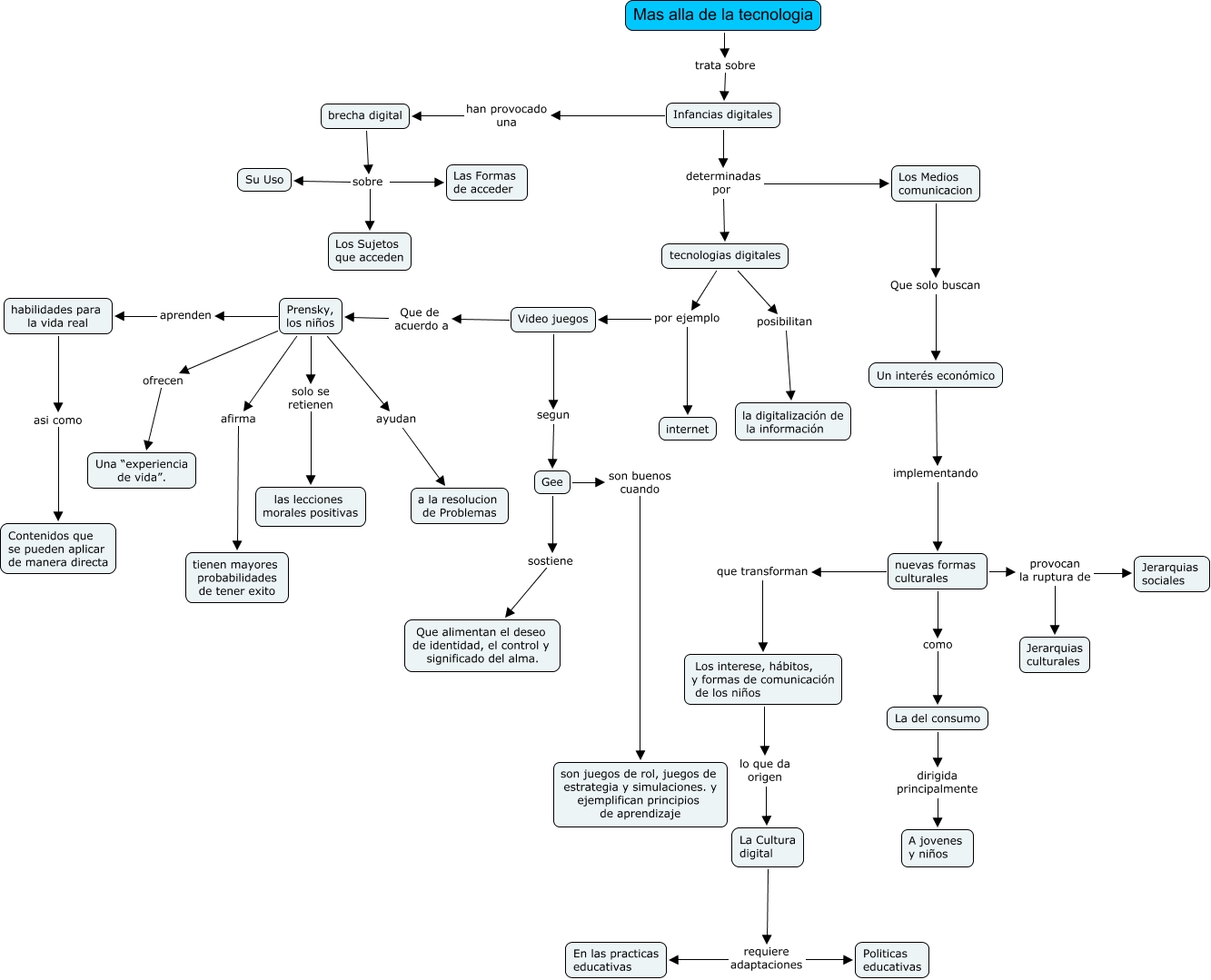 Este Cmap, tiene información relacionada con: Infancias Digitales, Infancias digitales determinadas por Los Medios comunicacion, Prensky, los niños ayudan a la resolucion de Problemas, tecnologias digitales posibilitan la digitalización de la información, La Cultura digital requiere adaptaciones Politicas educativas, Prensky, los niños aprenden habilidades para la vida real, Mas alla de la tecnologia trata sobre Infancias digitales, tecnologias digitales por ejemplo internet, Video juegos Que de acuerdo a Prensky, los niños, habilidades para la vida real asi como Contenidos que se pueden aplicar de manera directa, nuevas formas culturales como La del consumo, Los Medios comunicacion Que solo buscan Un interés económico, brecha digital sobre Su Uso, tecnologias digitales por ejemplo Video juegos, Prensky, los niños solo se retienen las lecciones morales positivas, Infancias digitales han provocado una brecha digital, La Cultura digital requiere adaptaciones En las practicas educativas, brecha digital sobre Los Sujetos que acceden, nuevas formas culturales provocan la ruptura de Jerarquias sociales, Prensky, los niños afirma tienen mayores probabilidades de tener exito, Prensky, los niños ofrecen Una “experiencia de vida”.