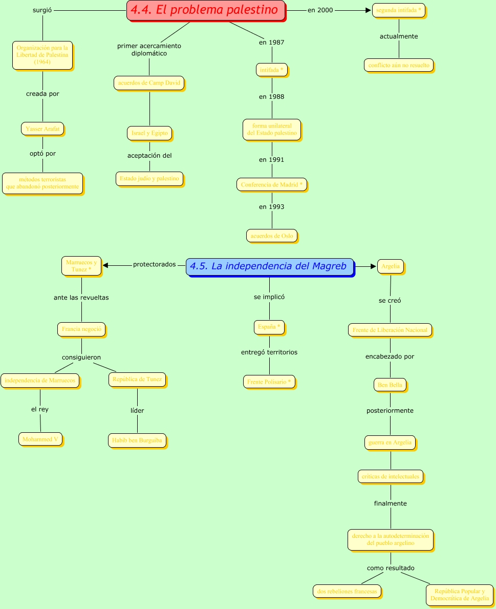 Este Cmap, tiene información relacionada con: puntos 4.4. y 4.5. tema 12, acuerdos de Camp David ???? Israel y Egipto, Organización para la Libertad de Palestina (1964) creada por Yasser Arafat, 4.4. El problema palestino surgió Organización para la Libertad de Palestina (1964), 4.5. La independencia del Magreb ???? Argelia, Frente de Liberación Nacional encabezado por Ben Bella, Francia negoció consiguieron República de Tunez, Ben Bella posteriormente guerra en Argelia, intifada * en 1988 forma unilateral del Estado palestino, 4.4. El problema palestino en 1987 intifada *, derecho a la autodeterminación del pueblo argelino como resultado República Popular y Democrática de Argelia, Marruecos y Tunez * ante las revueltas Francia negoció, 4.5. La independencia del Magreb se implicó España *, independencia de Marruecos el rey Mohammed V, Argelia se creó Frente de Liberación Nacional, 4.5. La independencia del Magreb protectorados Marruecos y Tunez *, críticas de intelectuales finalmente derecho a la autodeterminación del pueblo argelino, 4.4. El problema palestino en 2000 segunda intifada *, guerra en Argelia ???? críticas de intelectuales, Yasser Arafat optó por métodos terroristas que abandonó posteriormente, 4.4. El problema palestino primer acercamiento diplomático acuerdos de Camp David
