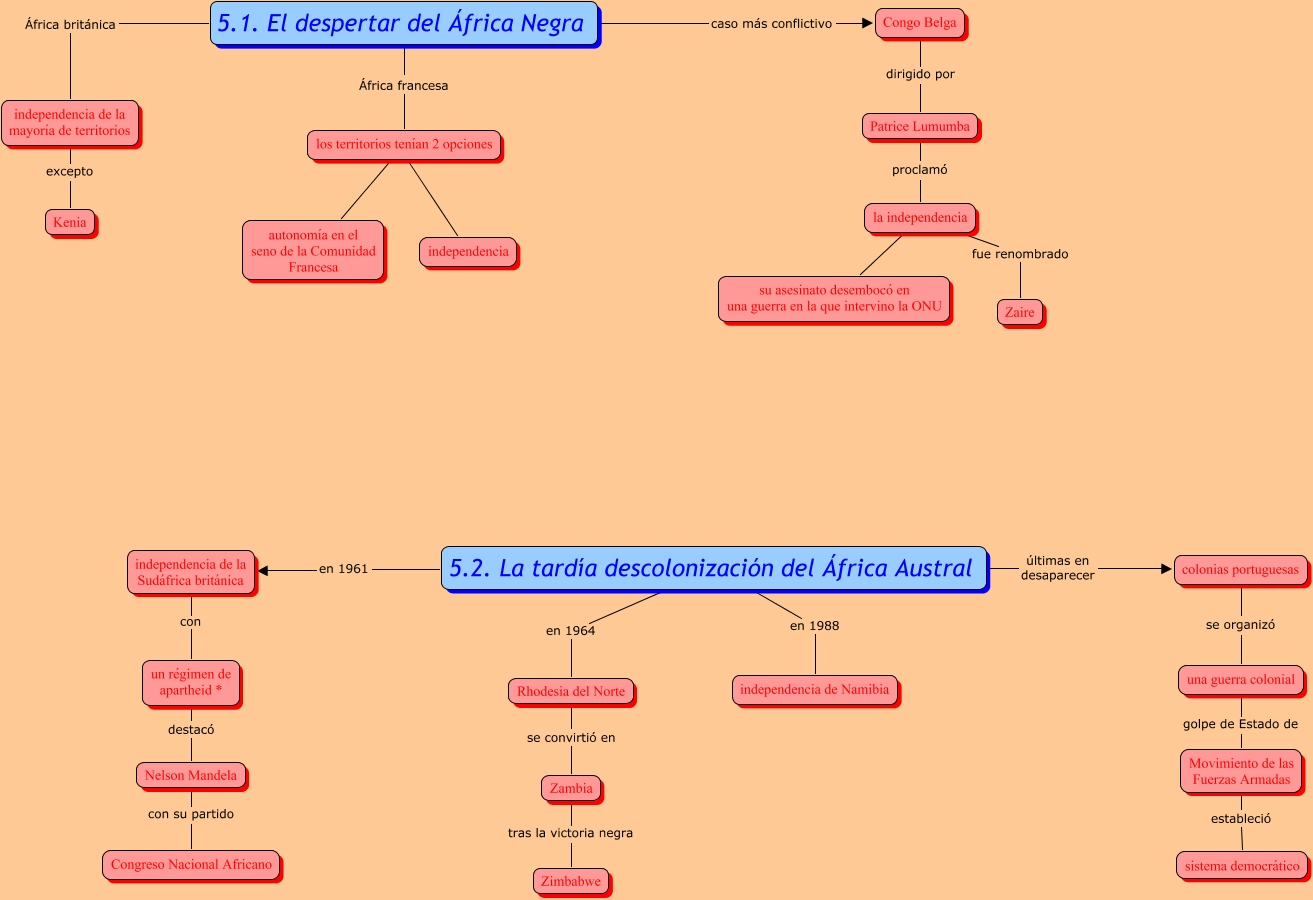 Este Cmap, tiene información relacionada con: punts 5.1. y 5.2. tema 12, Patrice Lumumba proclamó la independencia, Movimiento de las Fuerzas Armadas estableció sistema democrático, los territorios tenían 2 opciones ???? autonomía en el seno de la Comunidad Francesa, Zambia tras la victoria negra Zimbabwe, la independencia ???? su asesinato desembocó en una guerra en la que intervino la ONU, Rhodesia del Norte se convirtió en Zambia, 5.2. La tardía descolonización del África Austral en 1964 Rhodesia del Norte, Congo Belga dirigido por Patrice Lumumba, 5.2. La tardía descolonización del África Austral últimas en desaparecer colonias portuguesas, Nelson Mandela con su partido Congreso Nacional Africano, 5.1. El despertar del África Negra África británica independencia de la mayoría de territorios, 5.2. La tardía descolonización del África Austral en 1988 independencia de Namibia, independencia de la Sudáfrica británica con un régimen de apartheid *, un régimen de apartheid * destacó Nelson Mandela, una guerra colonial golpe de Estado de Movimiento de las Fuerzas Armadas, los territorios tenían 2 opciones ???? independencia, la independencia fue renombrado Zaire, independencia de la mayoría de territorios excepto Kenia, 5.1. El despertar del África Negra caso más conflictivo Congo Belga, colonias portuguesas se organizó una guerra colonial