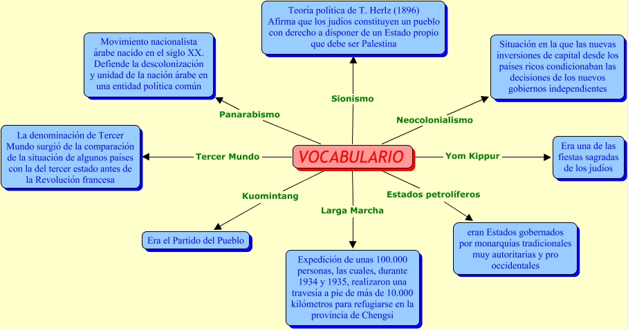 Este Cmap, tiene información relacionada con: vocabulario, VOCABULARIO Tercer Mundo La denominación de Tercer Mundo surgió de la comparación de la situación de algunos países con la del tercer estado antes de la Revolución francesa, VOCABULARIO Estados petrolíferos eran Estados gobernados por monarquías tradicionales muy autoritarias y pro occidentales, VOCABULARIO Neocolonialismo Situación en la que las nuevas inversiones de capital desde los países ricos condicionaban las decisiones de los nuevos gobiernos independientes, VOCABULARIO Larga Marcha Expedición de unas 100.000 personas, las cuales, durante 1934 y 1935, realizaron una travesía a pie de más de 10.000 kilómetros para refugiarse en la provincia de Chengsi, VOCABULARIO Yom Kippur Era una de las fiestas sagradas de los judíos, VOCABULARIO Kuomintang Era el Partido del Pueblo, VOCABULARIO Panarabismo Movimiento nacionalista árabe nacido en el siglo XX. Defiende la descolonización y unidad de la nación árabe en una entidad política común, VOCABULARIO Sionismo Teoría política de T. Herlz (1896) Afirma que los judíos constituyen un pueblo con derecho a disponer de un Estado propio que debe ser Palestina