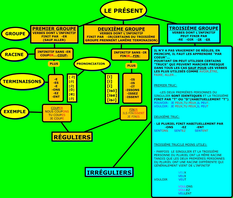 Este Cmap, tiene información relacionada con: LE PRÉSENT, PREMIER GROUPE VERBES DONT L'INFINITIF FINIT PAR -ER (SAUF ALLER) ???? INFINITIF SANS -ER COUPER....COUP-, RÉGULIERS ???? COUPER NOUS COUPONS TU COUPES JE COUPE, RÉGULIERS ???? FINIR ILS FINISSENT JE FINIS, GROUPE ???? PREMIER GROUPE VERBES DONT L'INFINITIF FINIT PAR -ER (SAUF ALLER), IRRÉGULIERS ???? IL N'Y A PAS VRAIEMENT DE RÈGLES, EN PRINCIPE, IL FAUT LES APPRENDRE "PAR COEUR"... POURTANT ON PEUT UTILISER CERTAINS "TRUCS" QUI PEUVENT MARCHER PRESQUE DANS TOUS LES CAS SAUF POUR LES VERBES LES PLUS UTILISÉS COMME AVOIR,ÊTRE, FAIRE, ALLER... PREMIER TRUC: -LES DEUX PREMIÈRES PERSONNES DU SINGULIER SONT IDENTIQUES ET LA TROISIÈME FINIT PAR "T" OU "D"(HABITUELLEMENT "T"). POUVOIR: JE PEUX,TU PEUX,IL PEUT. VOULOIR: JE PEUX,TU PEUX,IL PEUT DEUXIÈME TRUC: - LE PLURIEL FINIT HABITUELLEMENT PAR -ONS -EZ -ENT SENTONS SENTEZ SENTENT TROISIÈME TRUC(LE MOINS UTILE): - PARFOIS LE SINGULIER ET LA TROISIÈME PERSONNE DU PLURIEL ONT LA MÊME RACINE TANDIS QUE LES DEUX PREMIÈRES PERSONNES DU PLURIEL ONT UNE RACINE DIFFÉRENTE QUI GÉNÉRALEMENT VIENT DE L'INFINITIF VEUX VEUX VOULOIR VEUT VOULONS VOULEZ VEULENT, LE PRÉSENT ???? PREMIER GROUPE VERBES DONT L'INFINITIF FINIT PAR -ER (SAUF ALLER), INFINITIF SANS -ER COUPER....COUP- PLUS -E -ES -E -ONS -EZ -ENT, TERMINAISONS ???? -E -ES -E -ONS -EZ -ENT, LE PRÉSENT ???? DEUXIÈME GROUPE VERBES DONT L'INFINITIF FINIT PAR -IR(CERTAINS DU TROISIÈME GROUPE PRENNENT LAMÊME TERMINAISON), TROISIÈME GROUPE VERBES DONT L'INFINITIF PEUT FINIR PAR -RE -OIR -IR -ER ???? IL N'Y A PAS VRAIEMENT DE RÈGLES, EN PRINCIPE, IL FAUT LES APPRENDRE "PAR COEUR"... POURTANT ON PEUT UTILISER CERTAINS "TRUCS" QUI PEUVENT MARCHER PRESQUE DANS TOUS LES CAS SAUF POUR LES VERBES LES PLUS UTILISÉS COMME AVOIR,ÊTRE, FAIRE, ALLER... PREMIER TRUC: -LES DEUX PREMIÈRES PERSONNES DU SINGULIER SONT IDENTIQUES ET LA TROISIÈME FINIT PAR "T" OU "D"(HABITUELLEMENT "T"). POUVOIR: JE PEUX,TU PEUX,IL PEUT. VOULOIR: JE PEUX,TU PEUX,IL PEUT DEUXIÈME TRUC: - LE PLURIEL FINIT HABITUELLEMENT PAR -ONS -EZ -ENT SENTONS SENTEZ SENTENT TROISIÈME TRUC(LE MOINS UTILE): - PARFOIS LE SINGULIER ET LA TROISIÈME PERSONNE DU PLURIEL ONT LA MÊME RACINE TANDIS QUE LES DEUX PREMIÈRES PERSONNES DU PLURIEL ONT UNE RACINE DIFFÉRENTE QUI GÉNÉRALEMENT VIENT DE L'INFINITIF VEUX VEUX VOULOIR VEUT VOULONS VOULEZ VEULENT, EXEMPLE ???? COUPER NOUS COUPONS TU COUPES JE COUPE, LE PRÉSENT ???? TROISIÈME GROUPE VERBES DONT L'INFINITIF PEUT FINIR PAR -RE -OIR -IR -ER, PRONONCIATION ???? [ ∂] [∂] [∂] [Õ] [e] [∂], DEUXIÈME GROUPE VERBES DONT L'INFINITIF FINIT PAR -IR(CERTAINS DU TROISIÈME GROUPE PRENNENT LAMÊME TERMINAISON) ???? INFINITIF SANS -IR FINIR...FIN-, INFINITIF SANS -IR FINIR...FIN- PLUS -IS -IS -IT -ISSONS -ISSEZ -ISSENT, RACINE ???? INFINITIF SANS -ER COUPER....COUP-, PRONONCIATION ???? [i] [i] [i] [isÕ] [ise] [is∂]