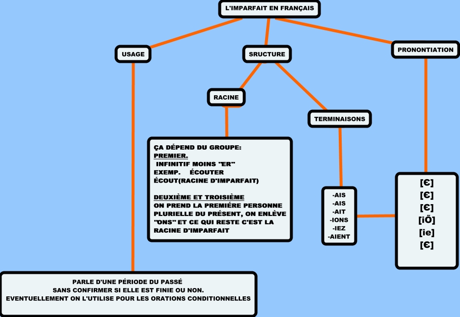 Este Cmap, tiene información relacionada con: L'IMPARFAIT, -AIS -AIS -AIT -IONS -IEZ -AIENT ???? TERMINAISONS, [Є] [Є] [Є] [iÕ] [ie] [Є] ???? -AIS -AIS -AIT -IONS -IEZ -AIENT, USAGE ???? PARLE D'UNE PÉRIODE DU PASSÉ SANS CONFIRMER SI ELLE EST FINIE OU NON. EVENTUELLEMENT ON L'UTILISE POUR LES ORATIONS CONDITIONNELLES, RACINE ???? SRUCTURE, SRUCTURE L'IMPARFAIT EN FRANÇAIS, L'IMPARFAIT EN FRANÇAIS ???? USAGE, TERMINAISONS ???? SRUCTURE, [Є] [Є] [Є] [iÕ] [ie] [Є] ???? PRONONTIATION, ÇA DÉPEND DU GROUPE: PREMIER. INFINITIF MOINS "ER" EXEMP. ÉCOUTER ÉCOUT(RACINE D'IMPARFAIT) DEUXIÈME ET TROISIÈME ON PREND LA PREMIÉRE PERSONNE PLURIELLE DU PRÉSENT, ON ENLÈVE "ONS" ET CE QUI RESTE C'EST LA RACINE D'IMPARFAIT ???? RACINE, PRONONTIATION ???? L'IMPARFAIT EN FRANÇAIS