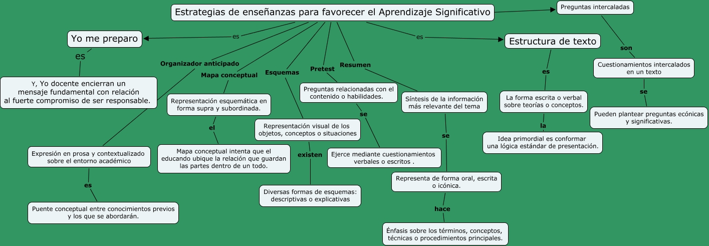 Este mapa conceptual tiene información relacionada a: Estrategias para favorecer el aprendizaje significativo, Estrategias de enseñanzas para favorecer el Aprendizaje Significativo Pretest Preguntas relacionadas con el contenido o habilidades., La forma escrita o verbal sobre teorías o conceptos. la Idea primordial es conformar una lógica estándar de presentación., Estrategias de enseñanzas para favorecer el Aprendizaje Significativo Organizador anticipado Expresión en prosa y contextualizado sobre el entorno académico, Estrategias de enseñanzas para favorecer el Aprendizaje Significativo Mapa conceptual Representación esquemática en forma supra y subordinada., Preguntas intercaladas son Cuestionamientos intercalados en un texto, Estrategias de enseñanzas para favorecer el Aprendizaje Significativo ???? Preguntas intercaladas, Estructura de texto es La forma escrita o verbal sobre teorías o conceptos., Representación visual de los objetos, conceptos o situaciones existen Diversas formas de esquemas: descriptivas o explicativas, Estrategias de enseñanzas para favorecer el Aprendizaje Significativo Esquemas Representación visual de los objetos, conceptos o situaciones, Estrategias de enseñanzas para favorecer el Aprendizaje Significativo es Yo me preparo, Estrategias de enseñanzas para favorecer el Aprendizaje Significativo es Estructura de texto, Representa de forma oral, escrita o icónica. hace Énfasis sobre los términos, conceptos, técnicas o procedimientos principales., Yo me preparo es Y, Yo docente encierran un mensaje fundamental con relación al fuerte compromiso de ser responsable., Cuestionamientos intercalados en un texto se Pueden plantear preguntas ecónicas y significativas., Preguntas relacionadas con el contenido o habilidades. se Ejerce mediante cuestionamientos verbales o escritos ., Estrategias de enseñanzas para favorecer el Aprendizaje Significativo Resumen Síntesis de la información más relevante del tema, Representación esquemática en forma supra y subordinada. el Mapa conceptual intenta que el educando ubique la relación que guardan las partes dentro de un todo., Síntesis de la información más relevante del tema se Representa de forma oral, escrita o icónica., Expresión en prosa y contextualizado sobre el entorno académico es Puente conceptual entre conocimientos previos y los que se abordarán.