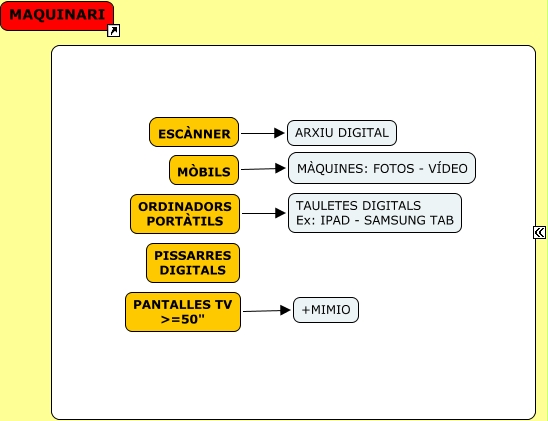 Aquest mapa conceptual conté informació relacionada amb: maquinari, ESCÀNNER ARXIU DIGITAL, MÒBILS MÀQUINES: FOTOS - VÍDEO, ORDINADORS PORTÀTILS TAULETES DIGITALS Ex: IPAD - SAMSUNG TAB, PANTALLES TV >=50" +MIMIO