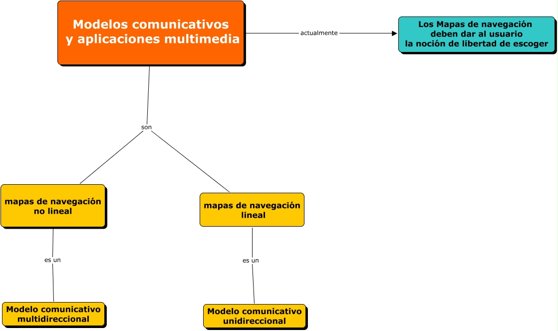 Este Cmap, tiene información relacionada con: modelos comunicativos, mapas de navegación no lineal es un Modelo comunicativo multidireccional, mapas de navegación lineal es un Modelo comunicativo unidireccional, Modelos comunicativos y aplicaciones multimedia son mapas de navegación lineal, Modelos comunicativos y aplicaciones multimedia son mapas de navegación no lineal, Modelos comunicativos y aplicaciones multimedia actualmente Los Mapas de navegación deben dar al usuario la noción de libertad de escoger
