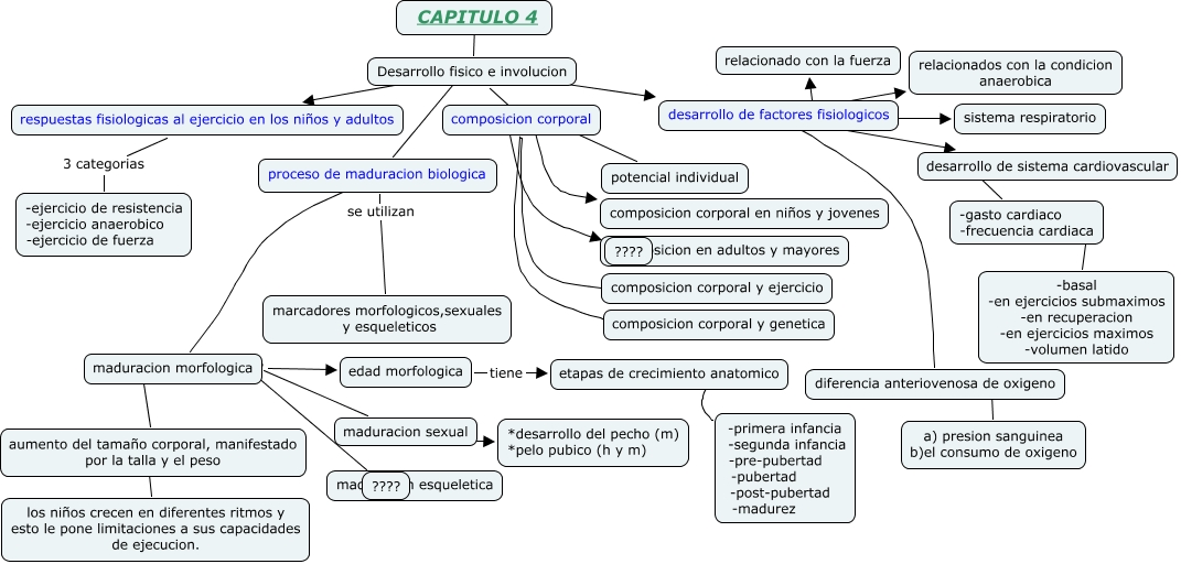 Este Cmap, tiene información relacionada con: capitulo 4 gui, diferencia anteriovenosa de oxigeno ???? a) presion sanguinea b)el consumo de oxigeno, etapas de crecimiento anatomico ???? -primera infancia -segunda infancia -pre-pubertad -pubertad -post-pubertad -madurez, Desarrollo fisico e involucion ???? respuestas fisiologicas al ejercicio en los niños y adultos, maduracion morfologica ???? aumento del tamaño corporal, manifestado por la talla y el peso, composicion corporal ???? composicion corporal y ejercicio, maduracion morfologica ???? ????, desarrollo de factores fisiologicos ???? relacionados con la condicion anaerobica, Desarrollo fisico e involucion ???? desarrollo de factores fisiologicos, Desarrollo fisico e involucion ???? proceso de maduracion biologica, desarrollo de factores fisiologicos ???? diferencia anteriovenosa de oxigeno, maduracion morfologica ???? edad morfologica, composicion corporal ???? composicion corporal en niños y jovenes, aumento del tamaño corporal, manifestado por la talla y el peso ???? los niños crecen en diferentes ritmos y esto le pone limitaciones a sus capacidades de ejecucion., maduracion morfologica ???? maduracion sexual, respuestas fisiologicas al ejercicio en los niños y adultos 3 categorias -ejercicio de resistencia -ejercicio anaerobico -ejercicio de fuerza, proceso de maduracion biologica se utilizan marcadores morfologicos,sexuales y esqueleticos, composicion corporal ???? ????, proceso de maduracion biologica ???? maduracion morfologica, desarrollo de factores fisiologicos ???? relacionado con la fuerza, -gasto cardiaco -frecuencia cardiaca ???? -basal -en ejercicios submaximos -en recuperacion -en ejercicios maximos -volumen latido