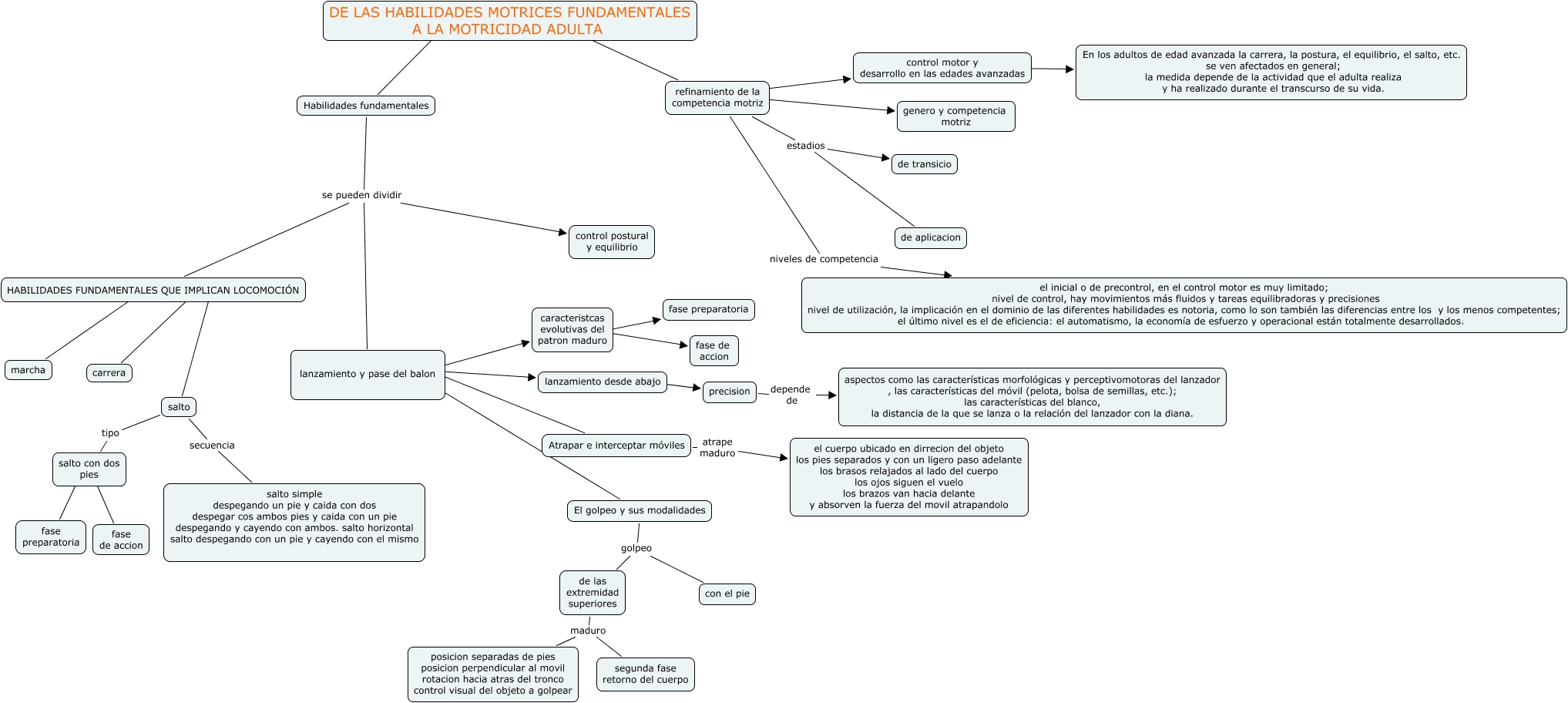 Este Cmap, tiene información relacionada con: capitulo 3, salto con dos pies fase fase preparatoria, HABILIDADES FUNDAMENTALES QUE IMPLICAN LOCOMOCIÓN ???? carrera, Habilidades fundamentales se pueden dividir HABILIDADES FUNDAMENTALES QUE IMPLICAN LOCOMOCIÓN, DE LAS HABILIDADES MOTRICES FUNDAMENTALES A LA MOTRICIDAD ADULTA ???? Habilidades fundamentales, Habilidades fundamentales se pueden dividir lanzamiento y pase del balon, de las extremidad superiores maduro posicion separadas de pies posicion perpendicular al movil rotacion hacia atras del tronco control visual del objeto a golpear, HABILIDADES FUNDAMENTALES QUE IMPLICAN LOCOMOCIÓN ???? salto, El golpeo y sus modalidades golpeo con el pie, lanzamiento y pase del balon ???? El golpeo y sus modalidades, refinamiento de la competencia motriz estadios de aplicacion, segunda fase retorno del cuerpo maduro posicion separadas de pies posicion perpendicular al movil rotacion hacia atras del tronco control visual del objeto a golpear, salto secuencia salto simple despegando un pie y caida con dos despegar cos ambos pies y caida con un pie despegando y cayendo con ambos. salto horizontal salto despegando con un pie y cayendo con el mismo, caracteristcas evolutivas del patron maduro ???? fase preparatoria, DE LAS HABILIDADES MOTRICES FUNDAMENTALES A LA MOTRICIDAD ADULTA ???? refinamiento de la competencia motriz, HABILIDADES FUNDAMENTALES QUE IMPLICAN LOCOMOCIÓN ???? marcha, caracteristcas evolutivas del patron maduro ???? fase de accion, refinamiento de la competencia motriz niveles de competencia el inicial o de precontrol, en el control motor es muy limitado; nivel de control, hay movimientos más fluidos y tareas equilibradoras y precisiones nivel de utilización, la implicación en el dominio de las diferentes habilidades es notoria, como lo son también las diferencias entre los y los menos competentes; el último nivel es el de eficiencia: el automatismo, la economía de esfuerzo y operacional están totalmente desarrollados., lanzamiento desde abajo ???? precision, precision depende de aspectos como las características morfológicas y perceptivomotoras del lanzador , las características del móvil (pelota, bolsa de semillas, etc.); las características del blanco, la distancia de la que se lanza o la relación del lanzador con la diana., refinamiento de la competencia motriz ???? control motor y desarrollo en las edades avanzadas