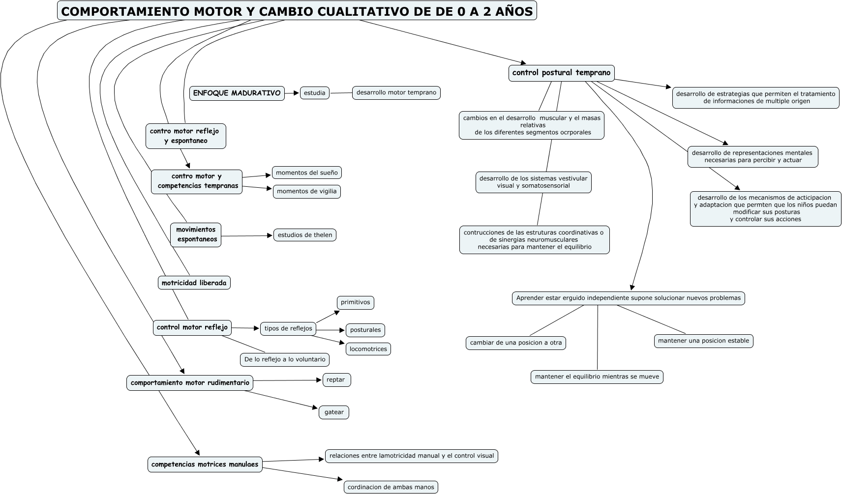 Este Cmap, tiene información relacionada con: capitulo_2, Aprender estar erguido independiente supone solucionar nuevos problemas ???? cambiar de una posicion a otra, COMPORTAMIENTO MOTOR Y CAMBIO CUALITATIVO DE DE 0 A 2 AÑOS ???? comportamiento motor rudimentario, COMPORTAMIENTO MOTOR Y CAMBIO CUALITATIVO DE DE 0 A 2 AÑOS ???? control motor reflejo, control motor reflejo ???? De lo reflejo a lo voluntario, estudia ???? desarrollo motor temprano, COMPORTAMIENTO MOTOR Y CAMBIO CUALITATIVO DE DE 0 A 2 AÑOS ???? control postural temprano, COMPORTAMIENTO MOTOR Y CAMBIO CUALITATIVO DE DE 0 A 2 AÑOS ???? movimientos espontaneos, tipos de reflejos ???? primitivos, COMPORTAMIENTO MOTOR Y CAMBIO CUALITATIVO DE DE 0 A 2 AÑOS ???? contro motor y competencias tempranas, Aprender estar erguido independiente supone solucionar nuevos problemas ???? mantener el equilibrio mientras se mueve, control postural temprano ???? Aprender estar erguido independiente supone solucionar nuevos problemas, COMPORTAMIENTO MOTOR Y CAMBIO CUALITATIVO DE DE 0 A 2 AÑOS ???? motricidad liberada, ENFOQUE MADURATIVO ???? estudia, control postural temprano ???? desarrollo de los mecanismos de acticipacion y adaptacion que permten que los niños puedan modificar sus posturas y controlar sus acciones, competencias motrices manulaes ???? cordinacion de ambas manos, comportamiento motor rudimentario ???? gatear, control postural temprano ???? cambios en el desarrollo muscular y el masas relativas de los diferentes segmentos ocrporales, contro motor y competencias tempranas ???? momentos del sueño, COMPORTAMIENTO MOTOR Y CAMBIO CUALITATIVO DE DE 0 A 2 AÑOS ???? contro motor reflejo y espontaneo, contro motor y competencias tempranas ???? momentos de vigilia