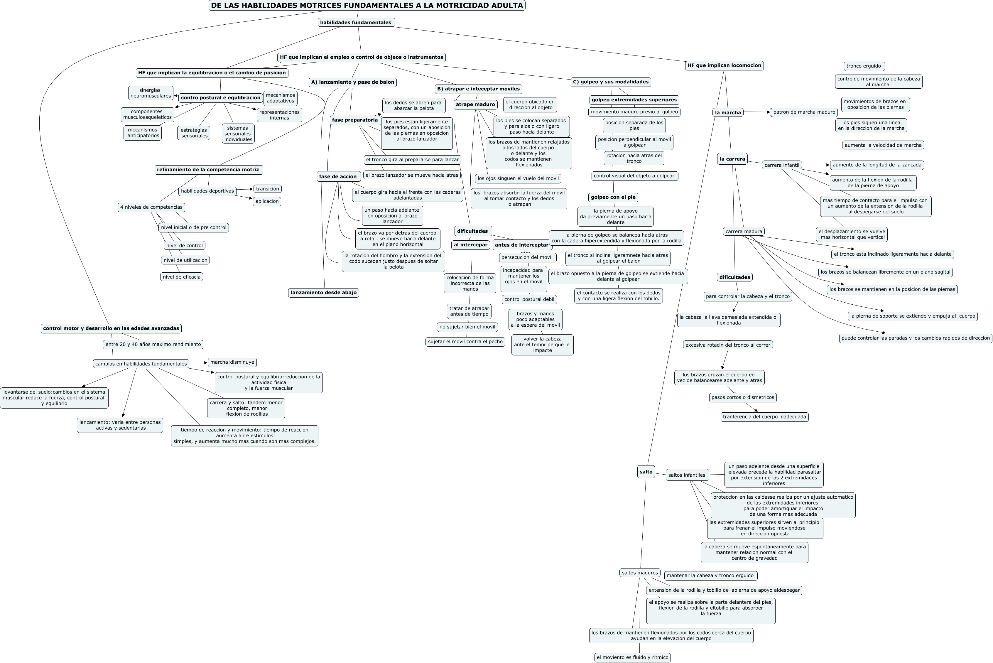 Este Cmap, tiene información relacionada con: capitulo_3, 4 niveles de competencias ???? nivel de eficacia, C) golpeo y sus modalidades ???? golpeo con el pie, contro postural e equlibracion ???? representaciones internas, contro postural e equlibracion ???? estrategias sensoriales, habilidades fundamentales ???? HF que implican locomocion, 4 niveles de competencias ???? nivel inicial o de pre control, los brazos cruzan el cuerpo en vez de balancearse adelante y atras ???? pasos cortos o dismetricos, colocacion de forma incorrecta de las manos ???? tratar de atrapar antes de tiempo, los brazos cruzan el cuerpo en vez de balancearse adelante y atras ???? tranferencia del cuerpo inadecuada, salto ???? saltos infantiles, contro postural e equlibracion ???? sistemas sensoriales individuales, saltos maduros ???? extension de la rodilla y tobillo de lapierna de apoyo aldespegar, fase de accion ???? el cuerpo gira hacia el frente con las caderas adelantadas, persecucion del movil ???? incapacidad para mantener los ojos en el movil, antes de interceptar ???? persecucion del movil, DE LAS HABILIDADES MOTRICES FUNDAMENTALES A LA MOTRICIDAD ADULTA ???? habilidades fundamentales, habilidades deportivas ???? transicion, fase de accion ???? la rotacion del hombro y la extension del codo suceden justo despues de soltar la pelota, fase de accion ???? el brazo va por detras del cuerpo a rotar. se mueve hacia delante en el plano horizontal, tratar de atrapar antes de tiempo ???? no sujetar bien el movil
